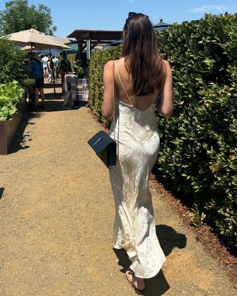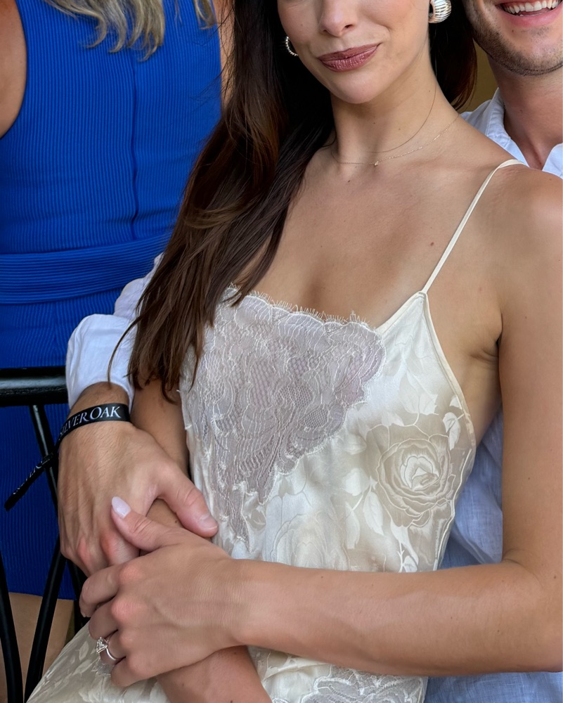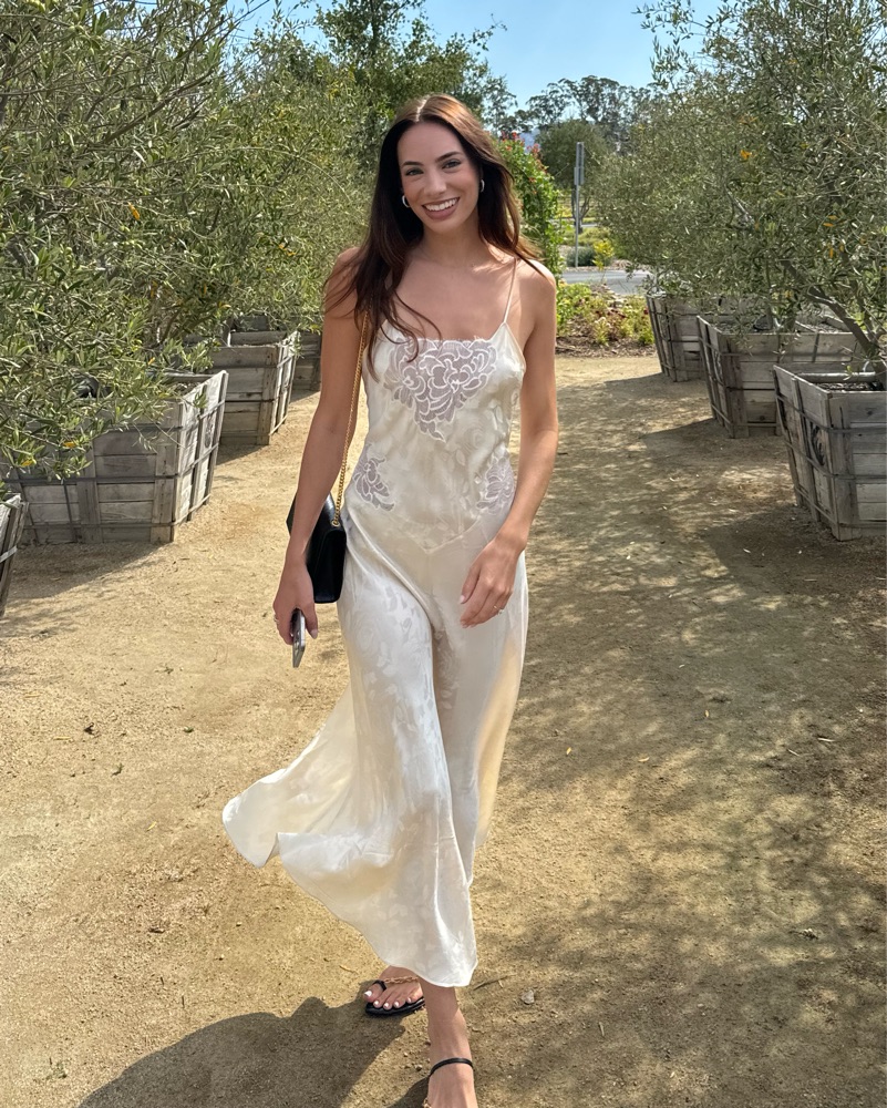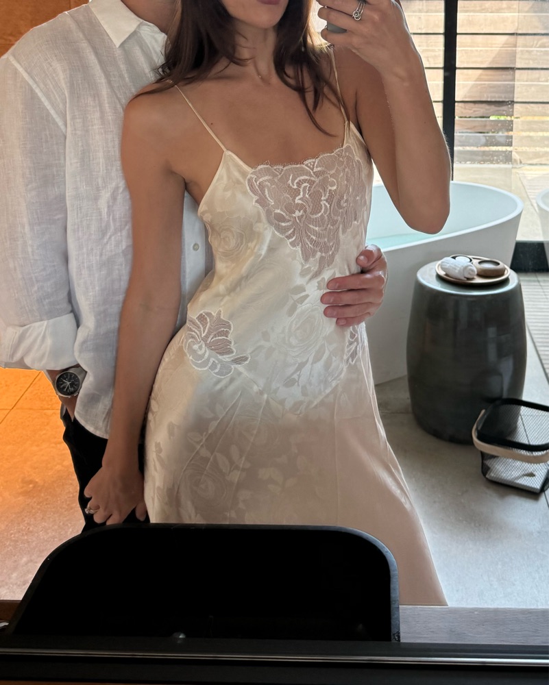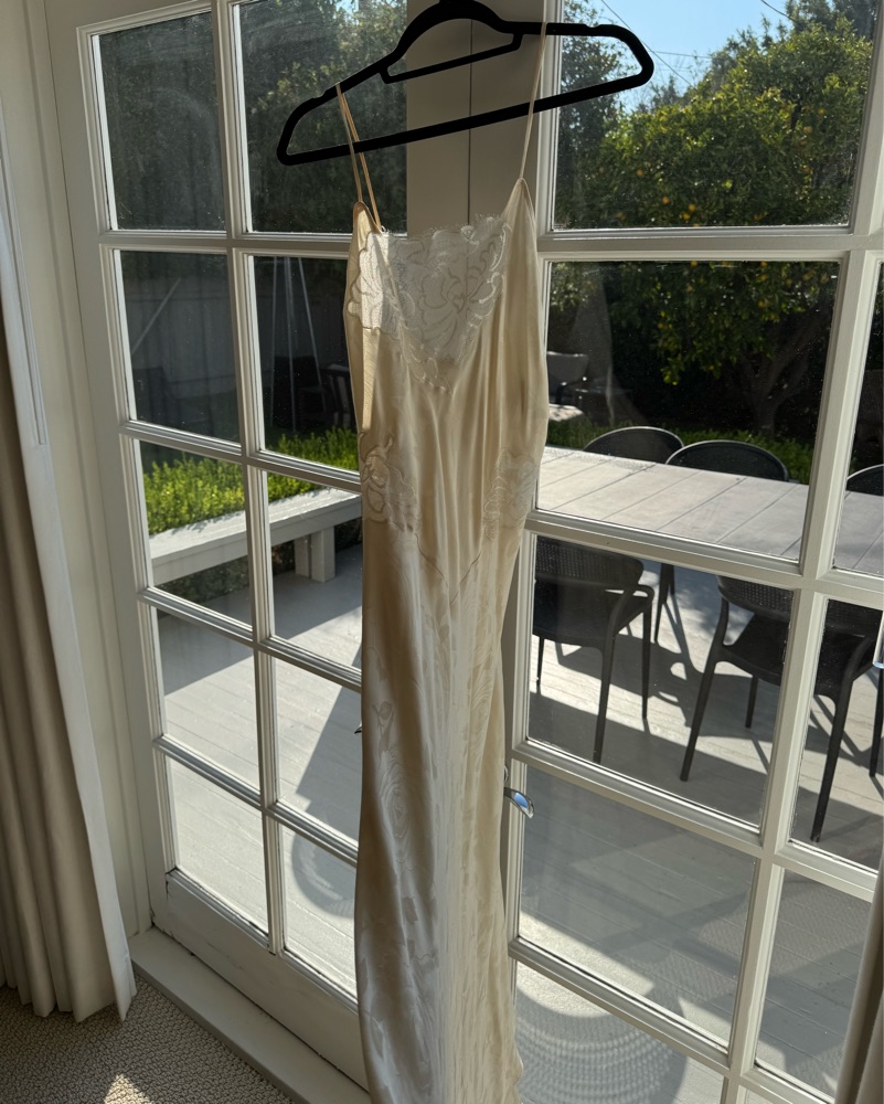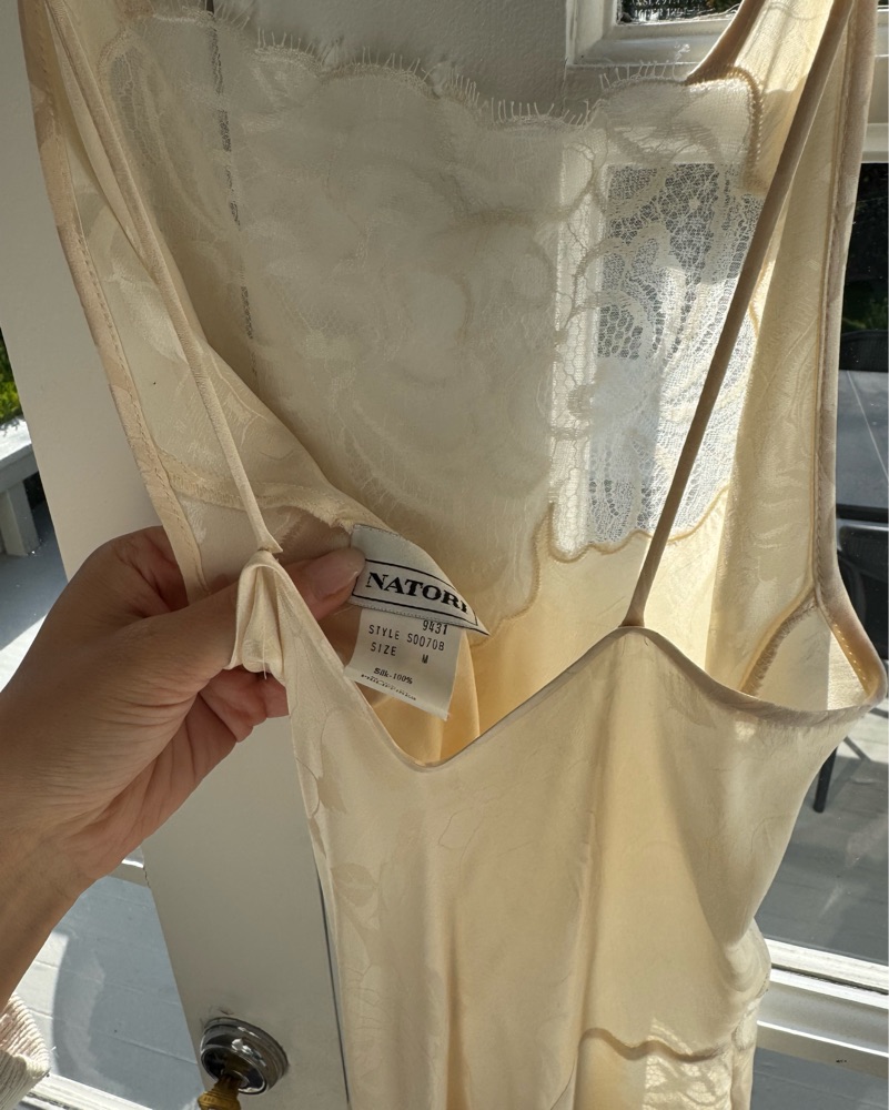 Vintage Natori silk maxi dress. Lacey ivory dress with white and ivory lace. I wore the day after I got engaged and it was the cutest little dress to celebrate in. Size Medium, but I’m a size 2 and it looked great as a flowy loose fitting dress. I’d say it could fit size 2-6