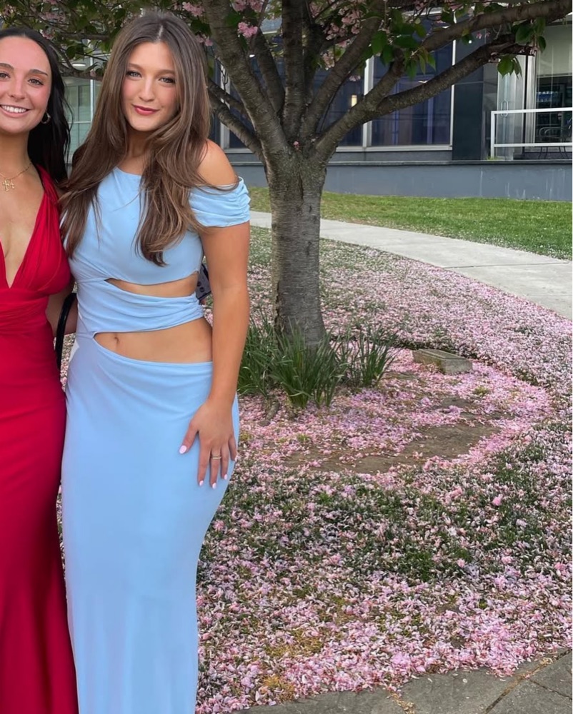 This elegant two-piece set is perfect for a formal event or special occasion. The vibrant colors and figure-flattering silhouette make for a stylish and sophisticated look.
