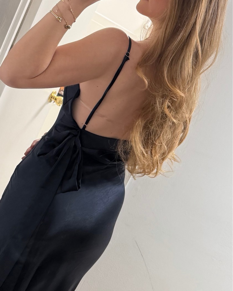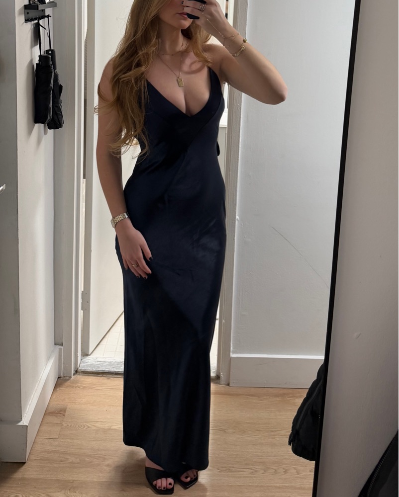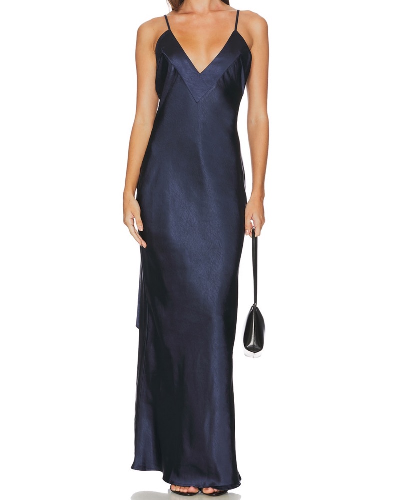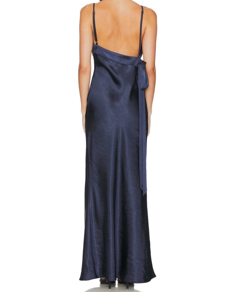 This stunning navy blue satin slip dress is perfect for a formal occasion or special event.