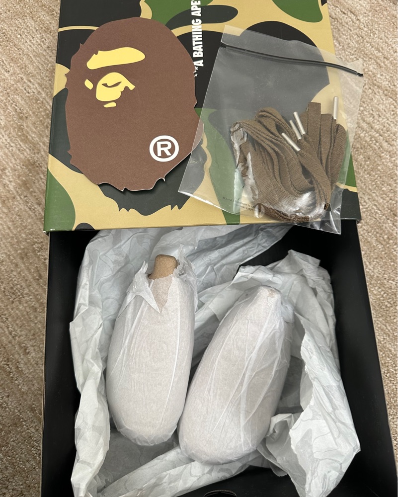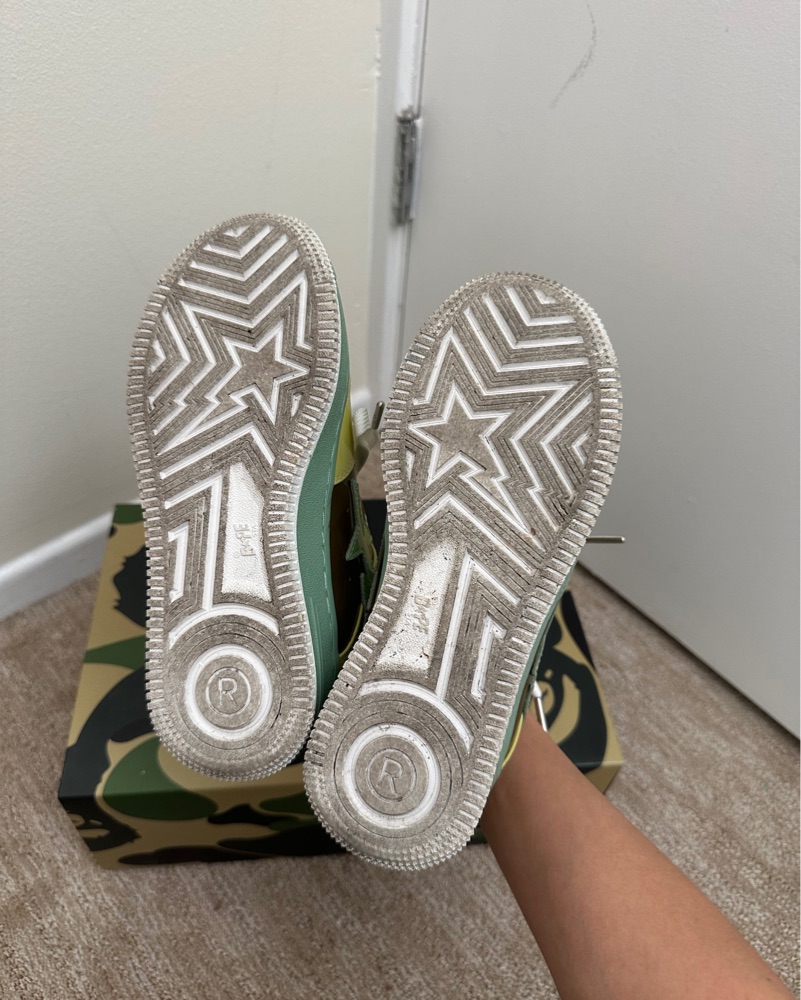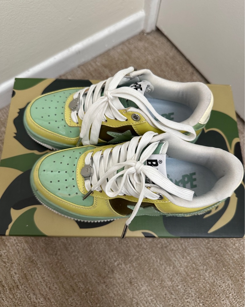 BAPE sta green and white trainers sneakers low top in nostalgic yellow green #BAPE seafoam green and coffee brown. Only worn out once. Comes with box and extra laces and dust bag. Patent finish. Size US men’s 4 women’s 6
