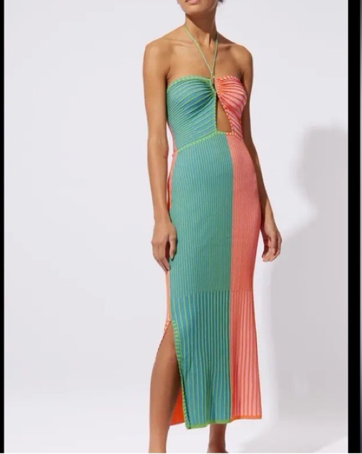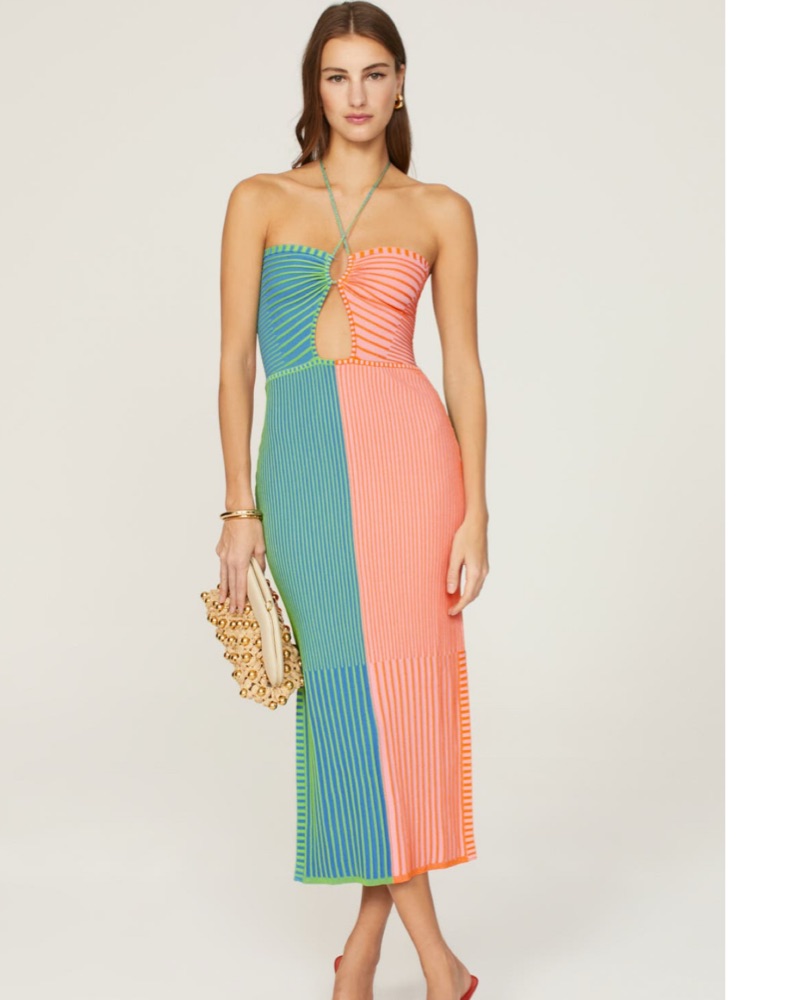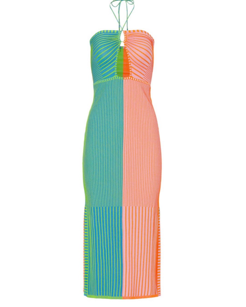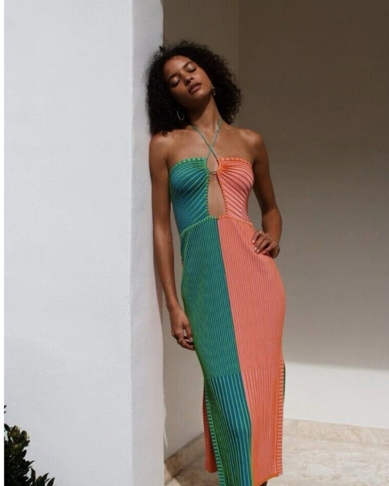This stunning color block dress is perfect for a fashionable night out. The halter neckline and form-fitting silhouette create a flattering look.