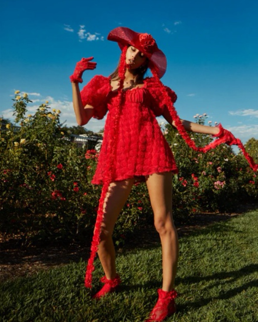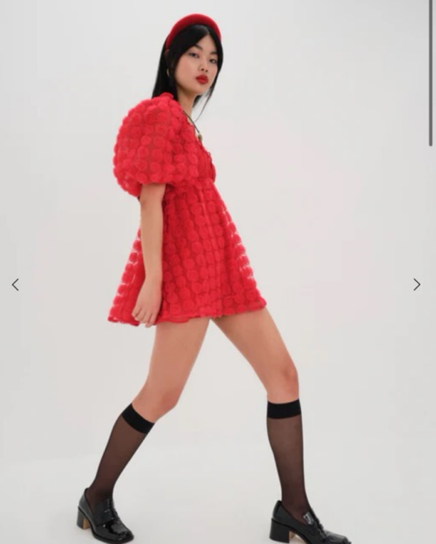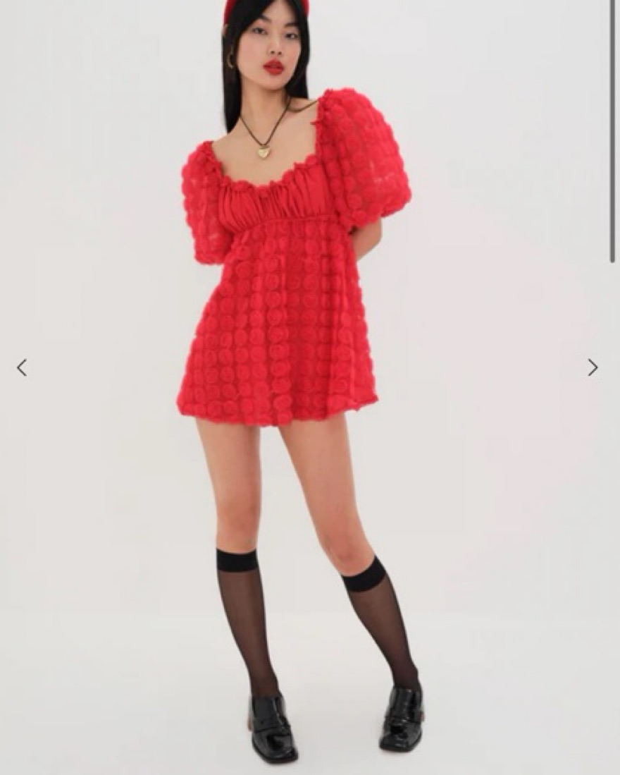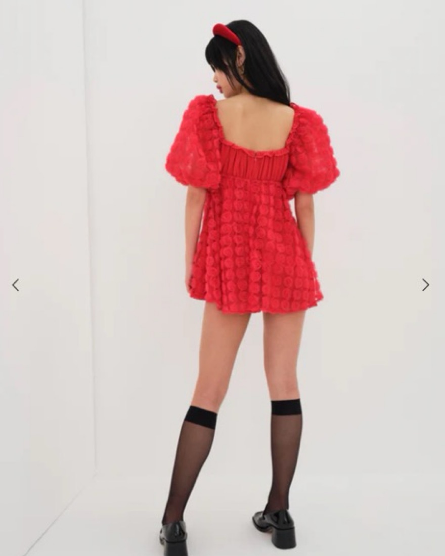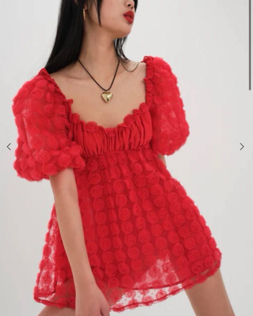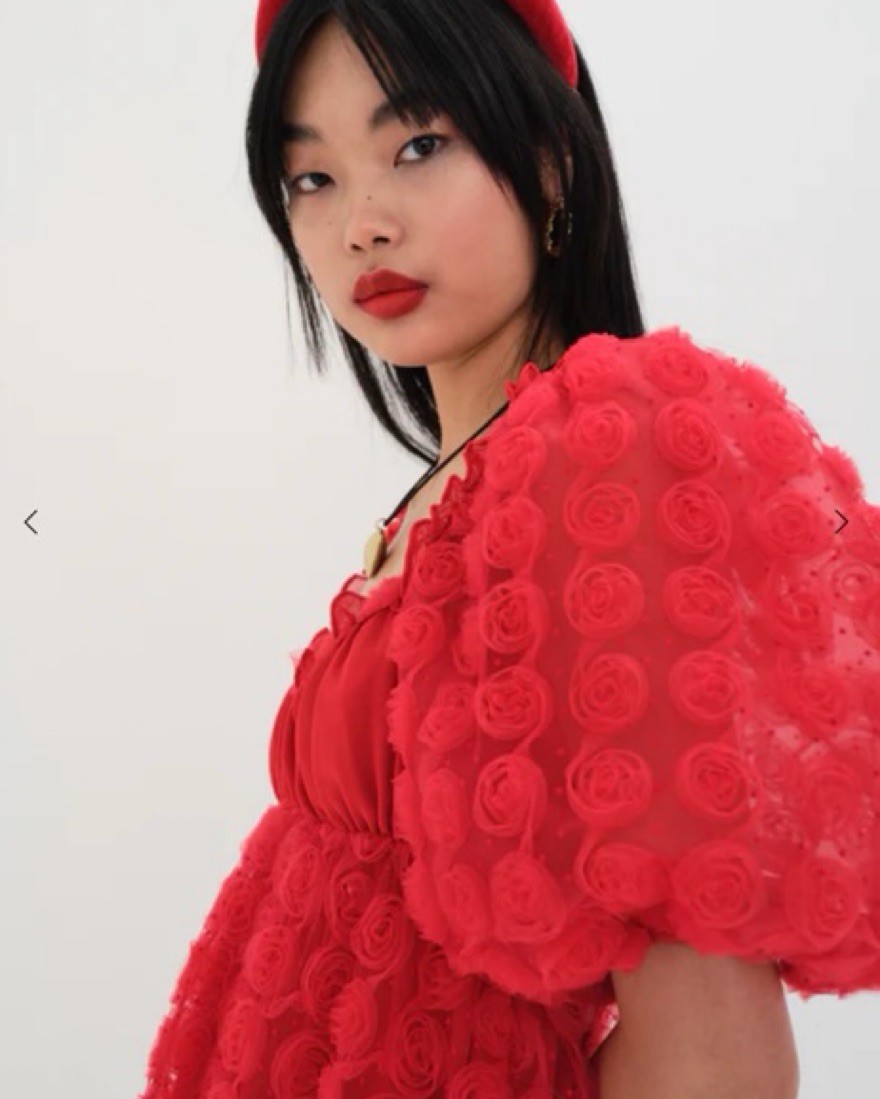 A wearable bouquet of red roses. This flirty chiffon style guarantees you a top spot on holiday best-dressed lists. Featuring puff sleeves and 3D rosettes
