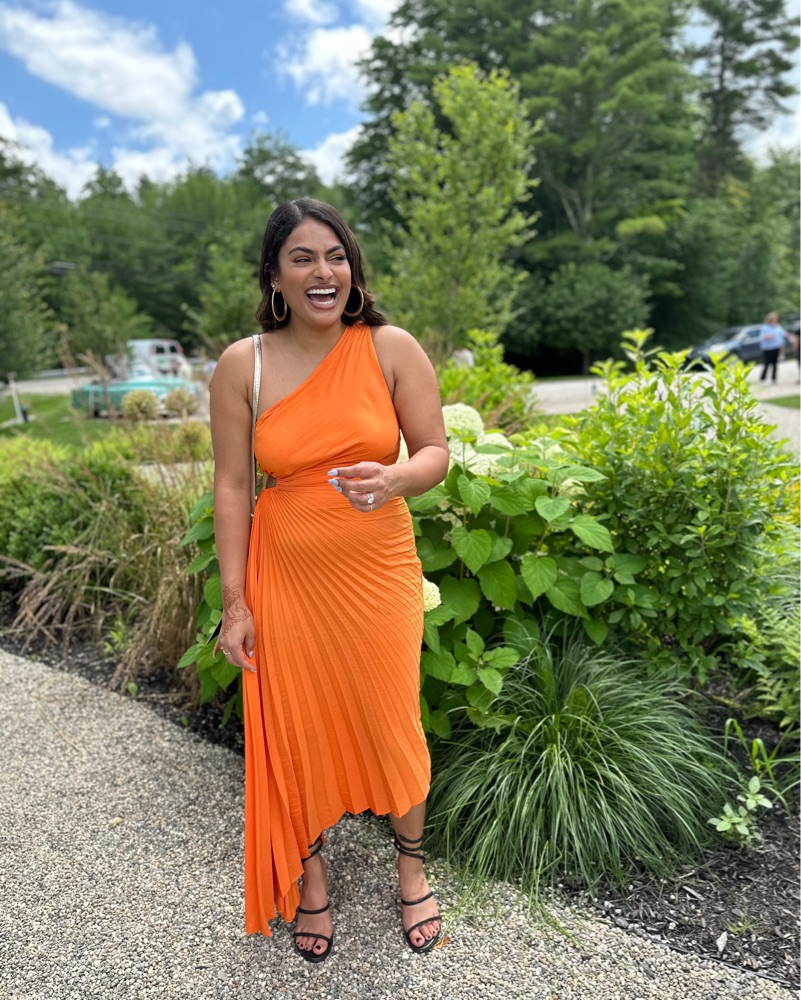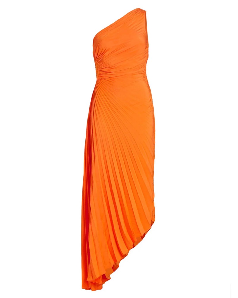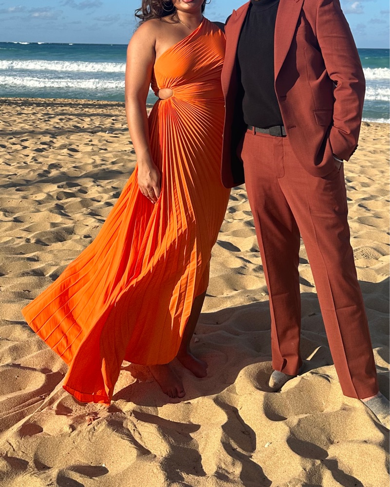 This stunning pleated maxi dress is perfect for a beach wedding or evening cocktail event. The vibrant orange color and asymmetric neckline create an elegant, head-turning look.