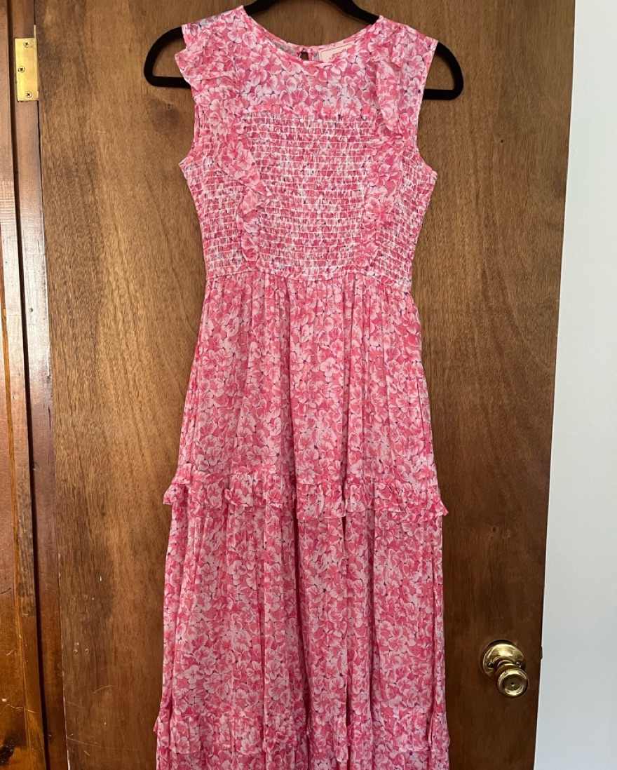 Flowy cotton dress with ruching on bodice. Perfect for beach wedding! Would probably fit sizes 0-4.