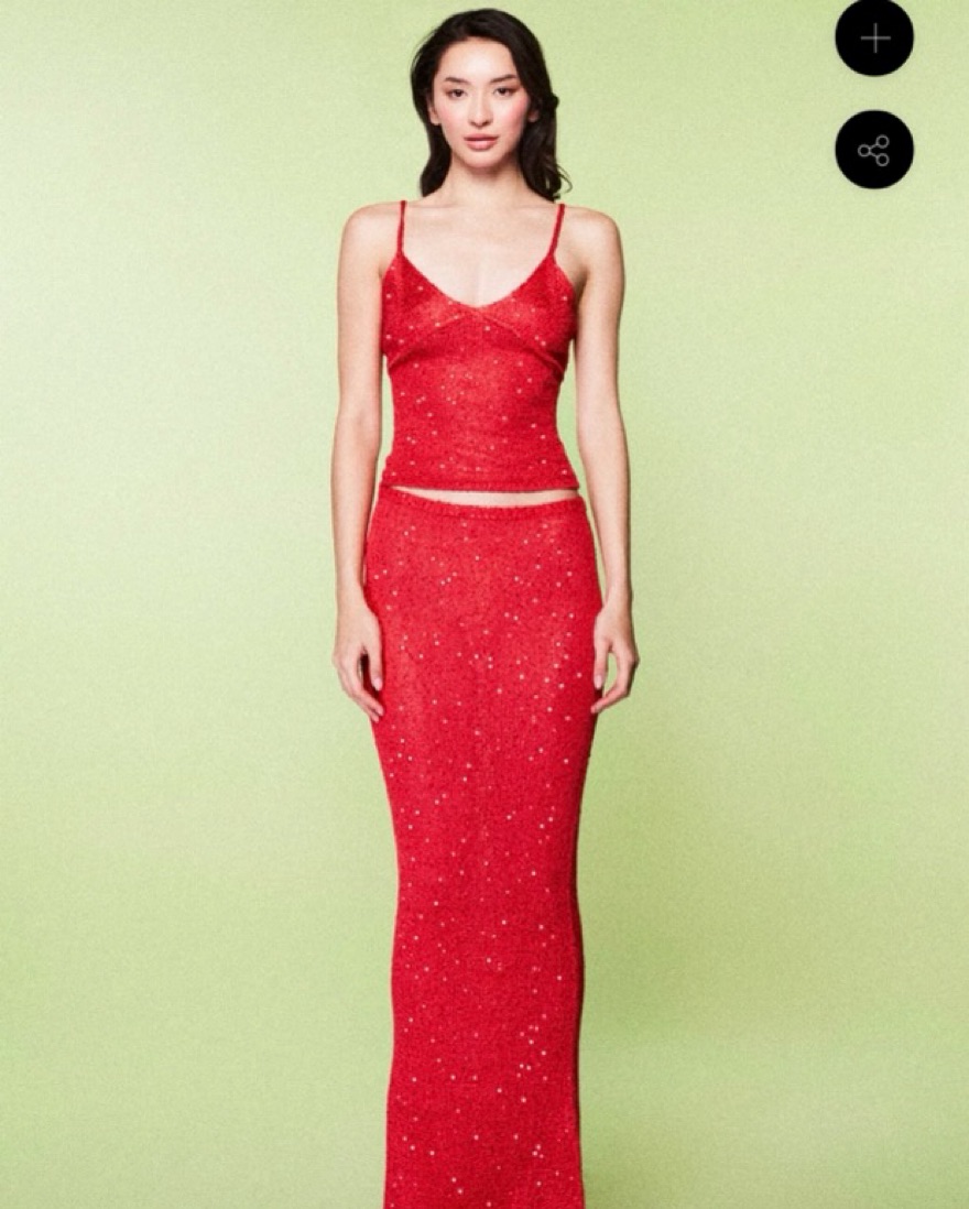 The Carolina Camisole in Rossa Sequin and Skirt by ASTA RESORT. A scintillating thin-strap camisole with a V neckline, knitted from a our signature cotton-based yarn with micro-sequins throughout. A scintillating floor length skirt made from a luxurious cotton-based knit with micro sequins.