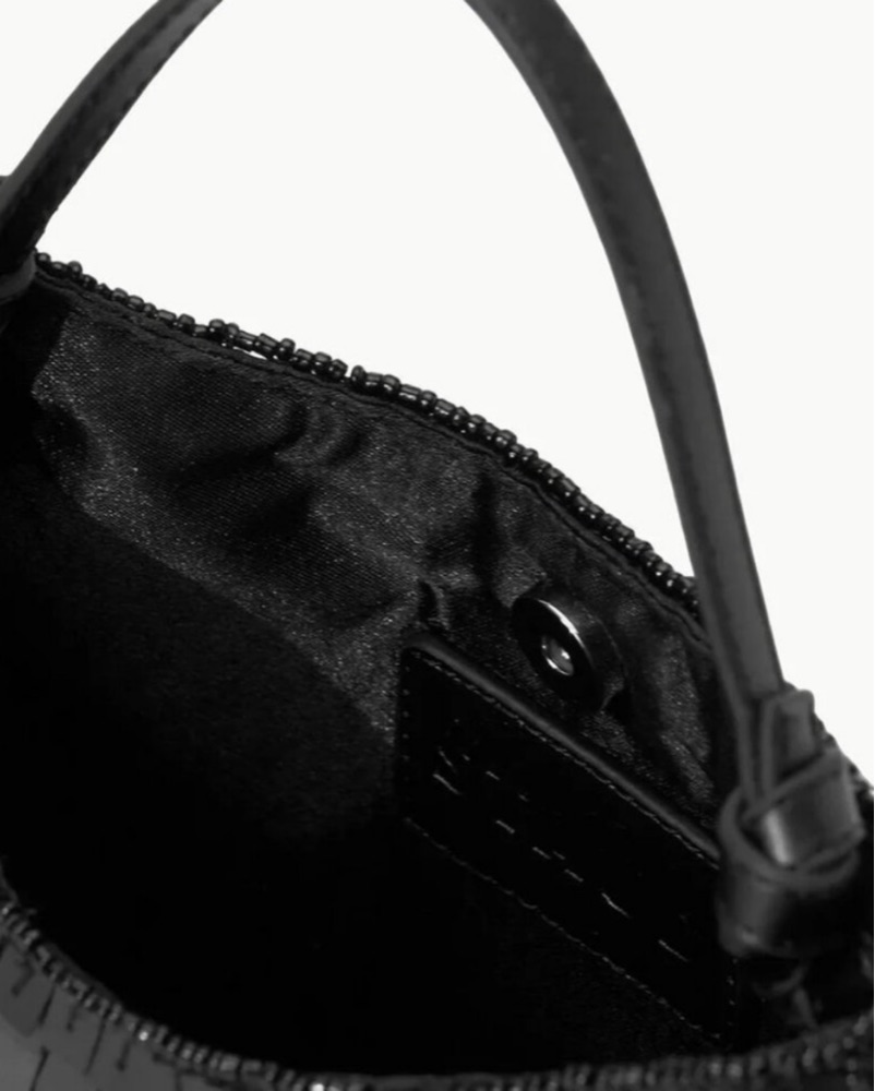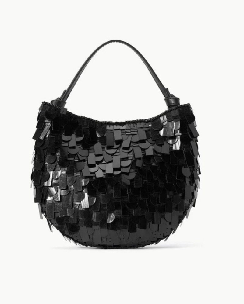 The Staud Crescent Mini Bag features a knotted fixed carry handle, a magnetic closure, and a satin lining. This sequined shoulder bag is adorned with beaded trim throughout. The dimensions are H6 x W7 x D1. Perfect for a special occasion like a wedding or bachelorette!