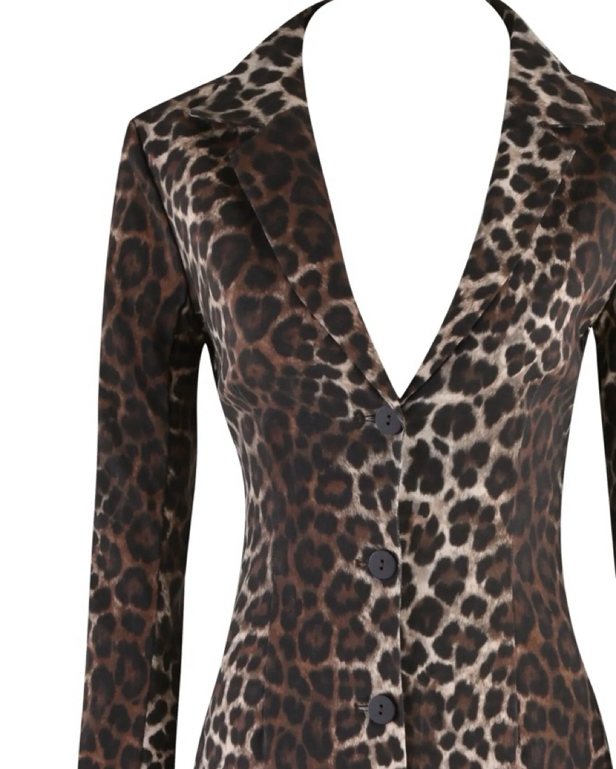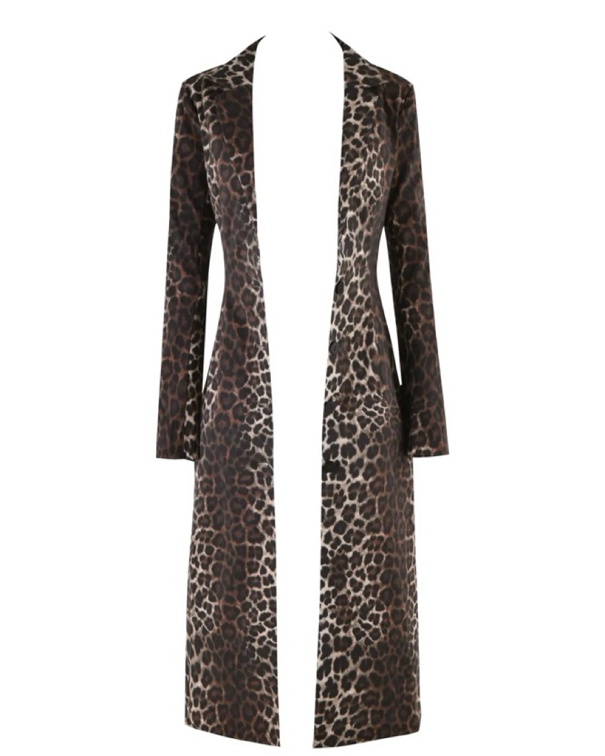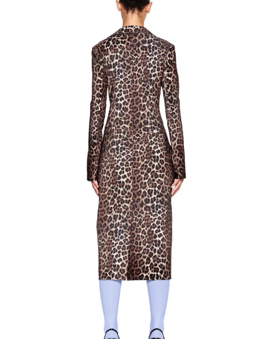 never worn! Tailored coat in a custom neutral tone leopard print. Midi length jacket is fitted through bodice and hips then finishes straight