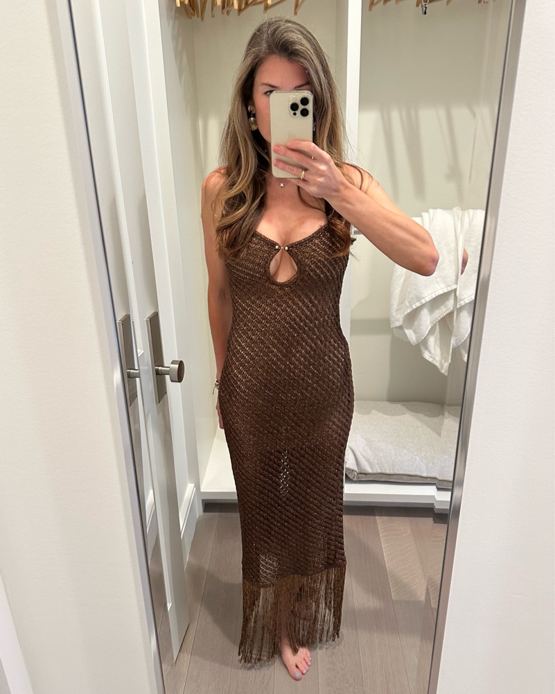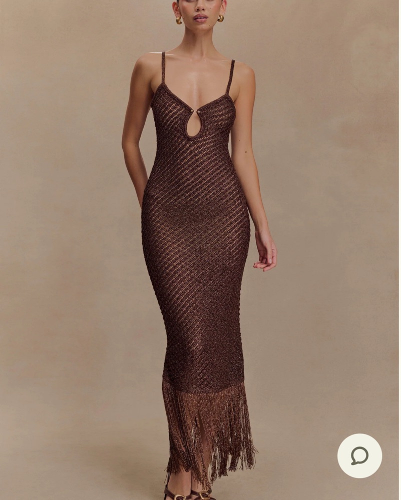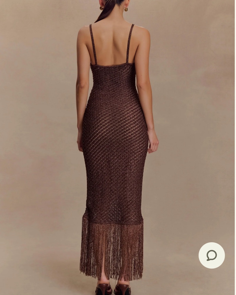 Chocolate Metallic knit dress with fringe and gold hardware.