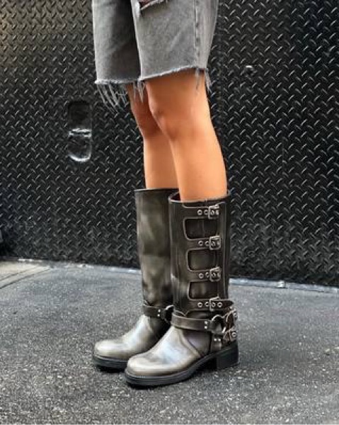 The ROCKY knee boot features the wide profile of an engineer boot with harness and buckle hardware adding an industrial edge and giving the design an adjustable fit.