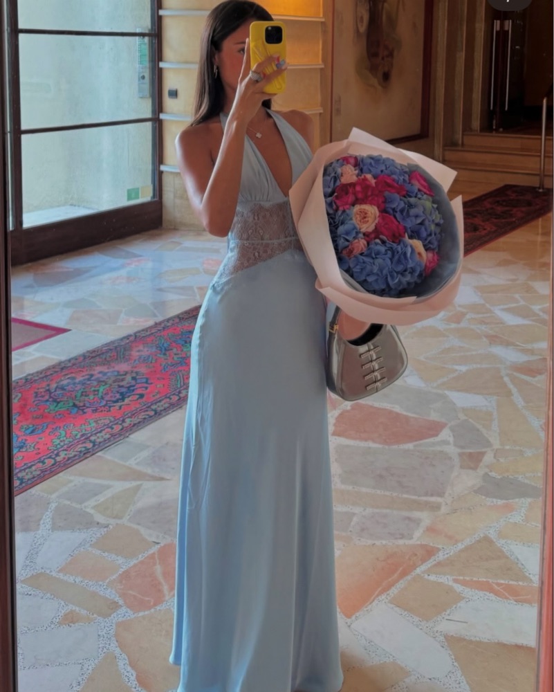 Meshki satin Dinah maxi dress in cornflower blue (XS). Stunning floor length, backless baby blue gown with a halter neck and lace detail