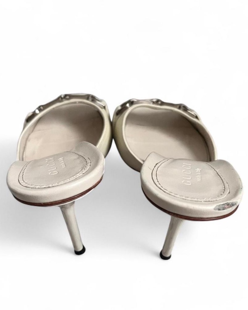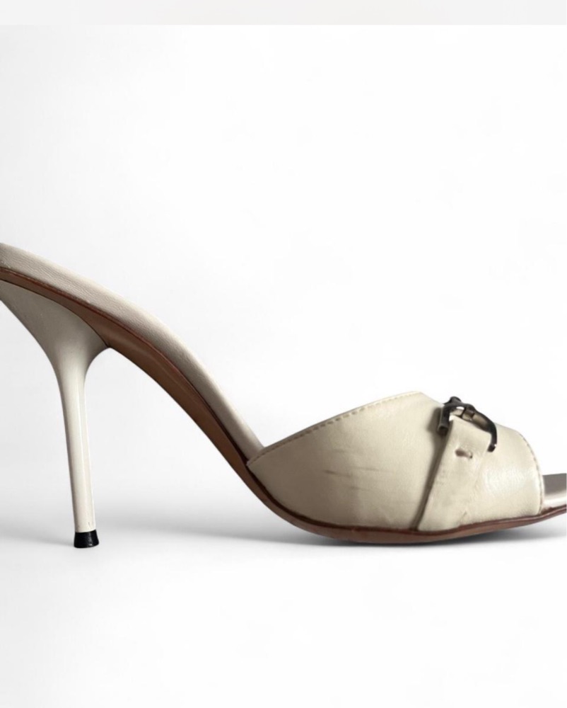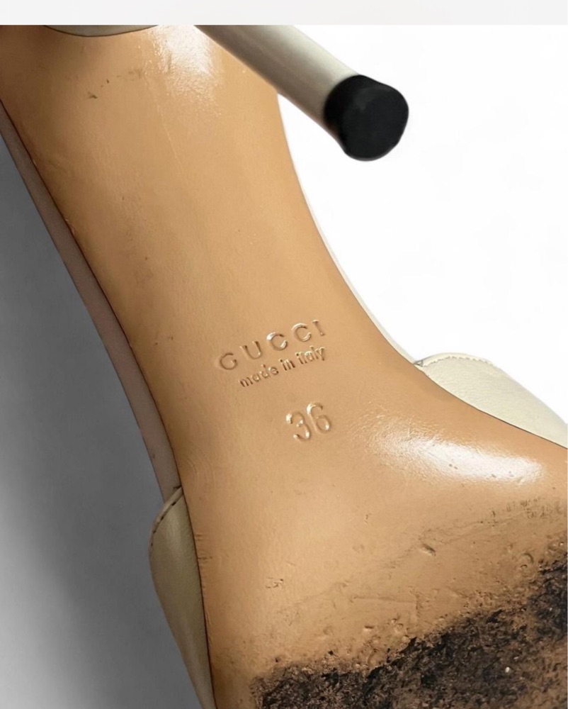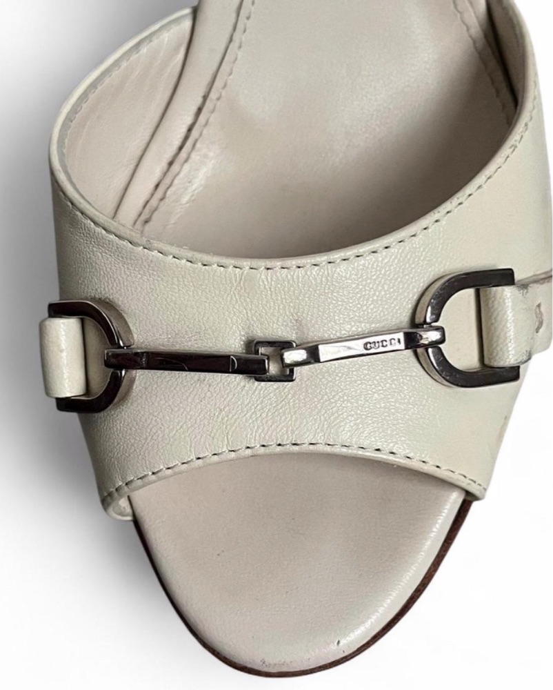 White/cream leather with metal horsebit detail. Soles have moderate wear. Full disclosure to protect renter: shoes have scuffs on the inside (as pictured - not noticeable) & small knick on the back of the right heel (also pictured) Otherwise in great condition. Very, very comfortable. Size 36.