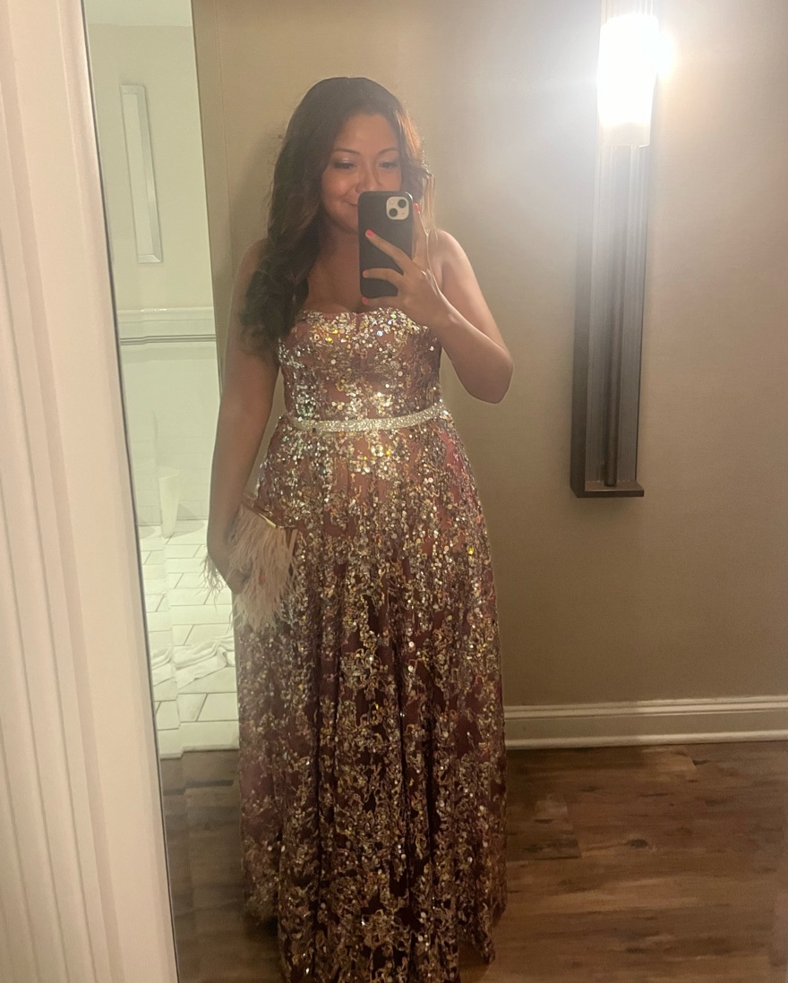 The most beautiful and show stopping gown! Sparkly and floor length. Perfect for a black tie wedding. Worn once and altered for a petite person (I’m 5’1). Runs small!