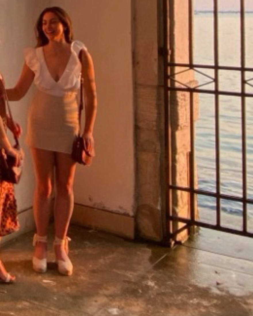 Deep V neck; ruffle sleeves; elastic waistband; cropped; stark white color