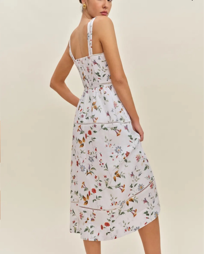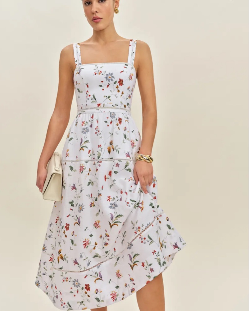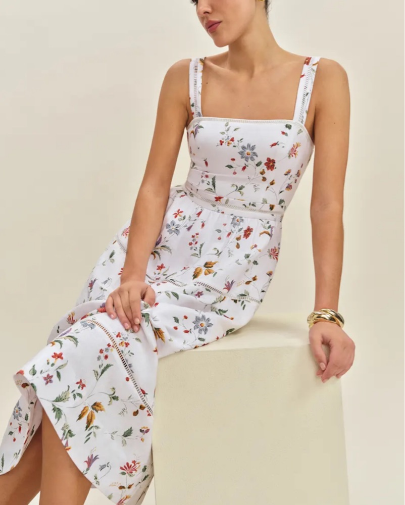 White floral linen dress. Technically a midi but on the longer side if you’re 5’4” or shorter. SO flattering, it’s one of my favorites ever :))