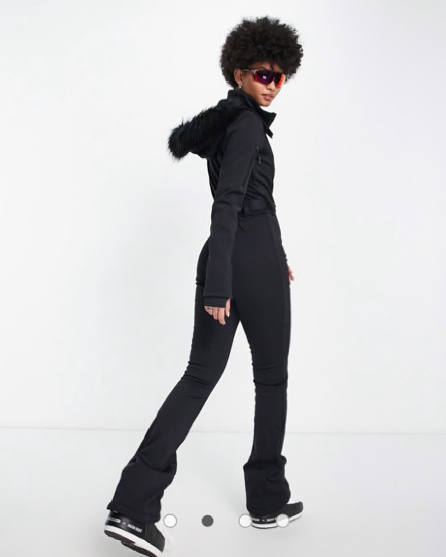 ASOS belted ski suit with slim kick leg and faux fur hood. This ski suit is incredibly comfortable and lightweight, but also fairly warm. Size 6.