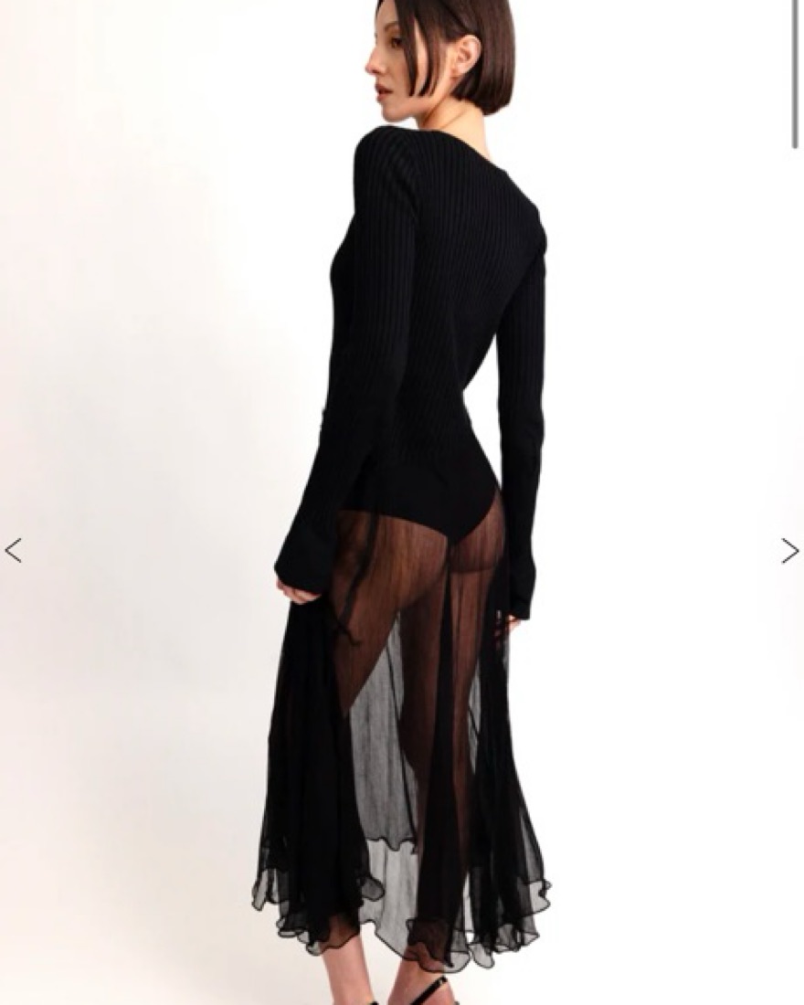 With Jean dress, perfect for the fall! Some holes in the seams of the sheer part from renting out- however kind of helps add to the vibe of the look :)