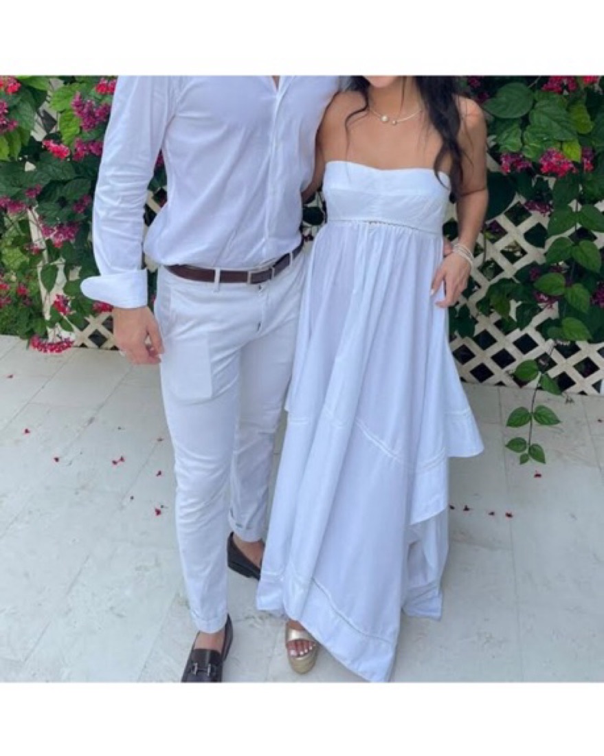 This elegant white maxi dress is perfect for a summer wedding or beach vacation. The flowy, strapless silhouette creates a romantic, feminine look.