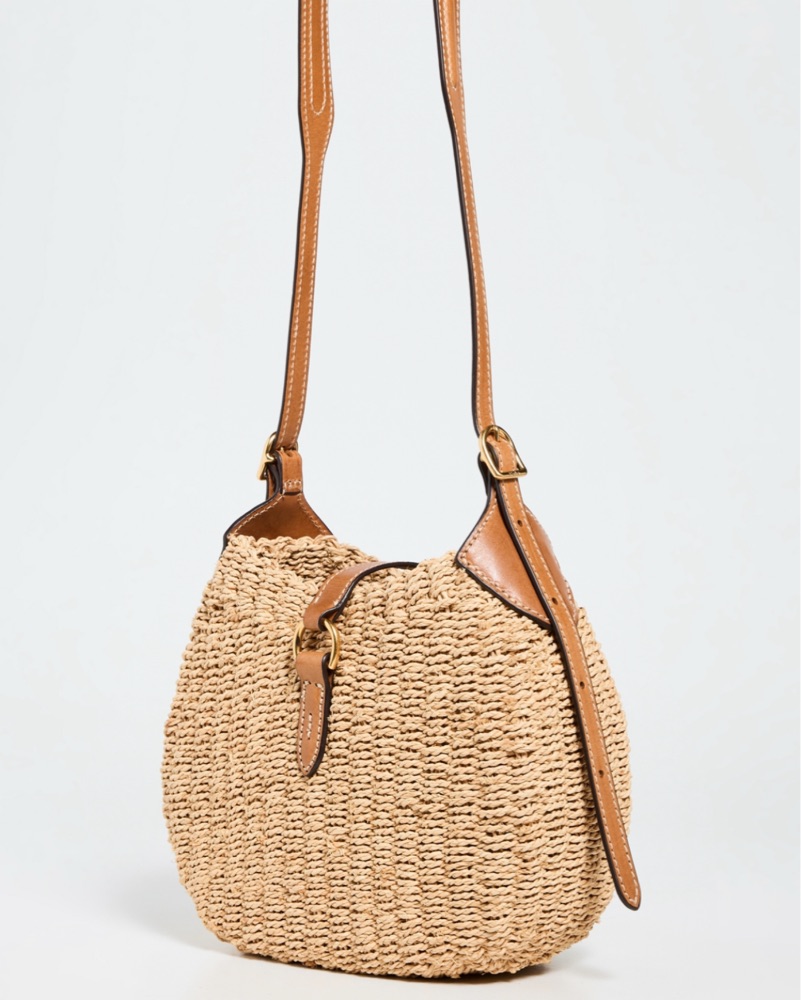 • Twisted raffia. Leather trim. Comes with two adjustable straps.