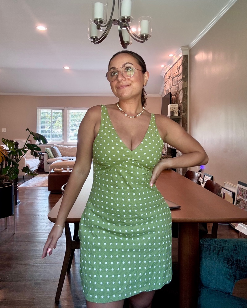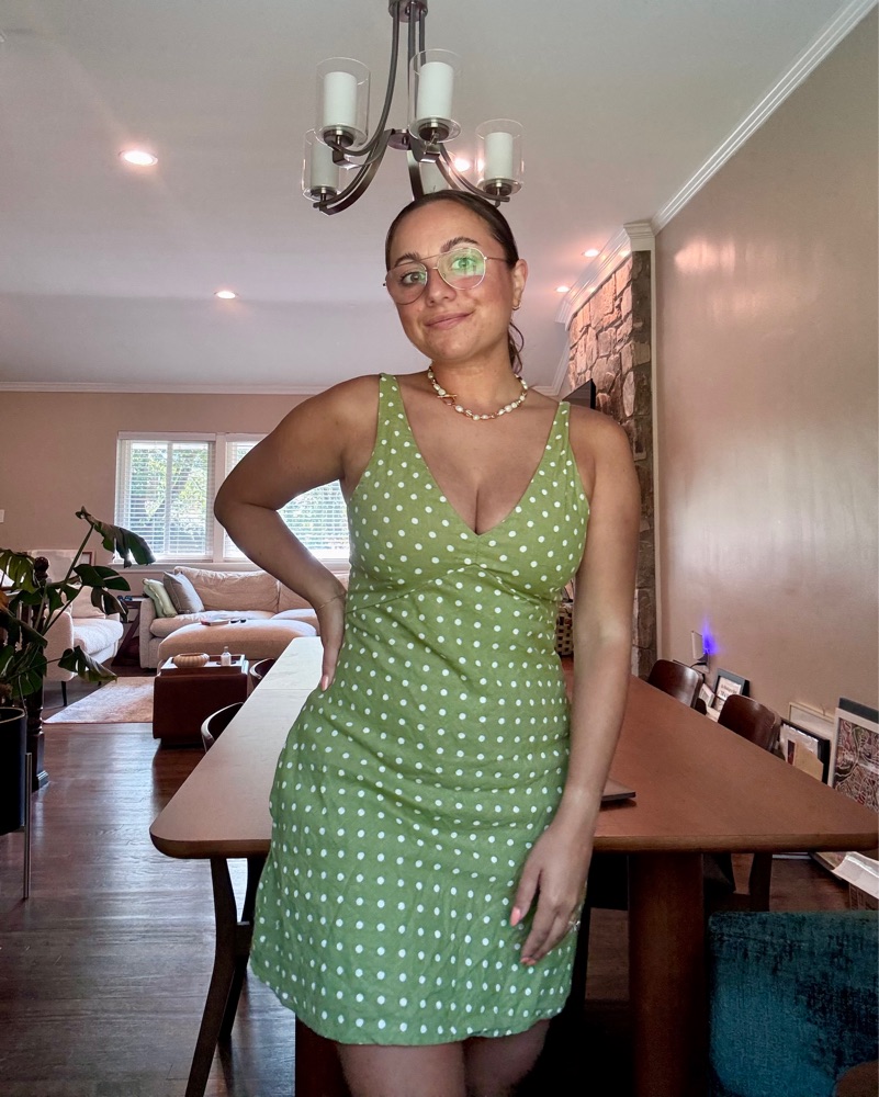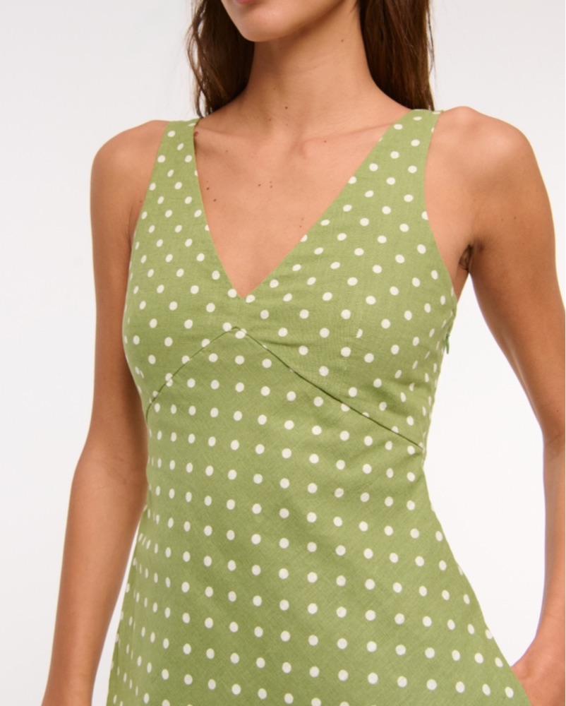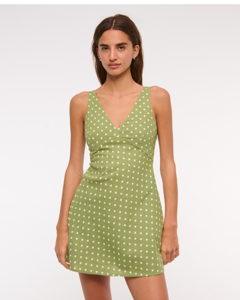 From A&F, this is a green polka dot linen mini dress with a v necks straps are adjustable and the back has some some stretch. I’m a size 6, 32DD and I wish I had gotten a medium just bc of my bust lol. It is SHORT and I’m 5’1! Has pockets and once on it is comfy!