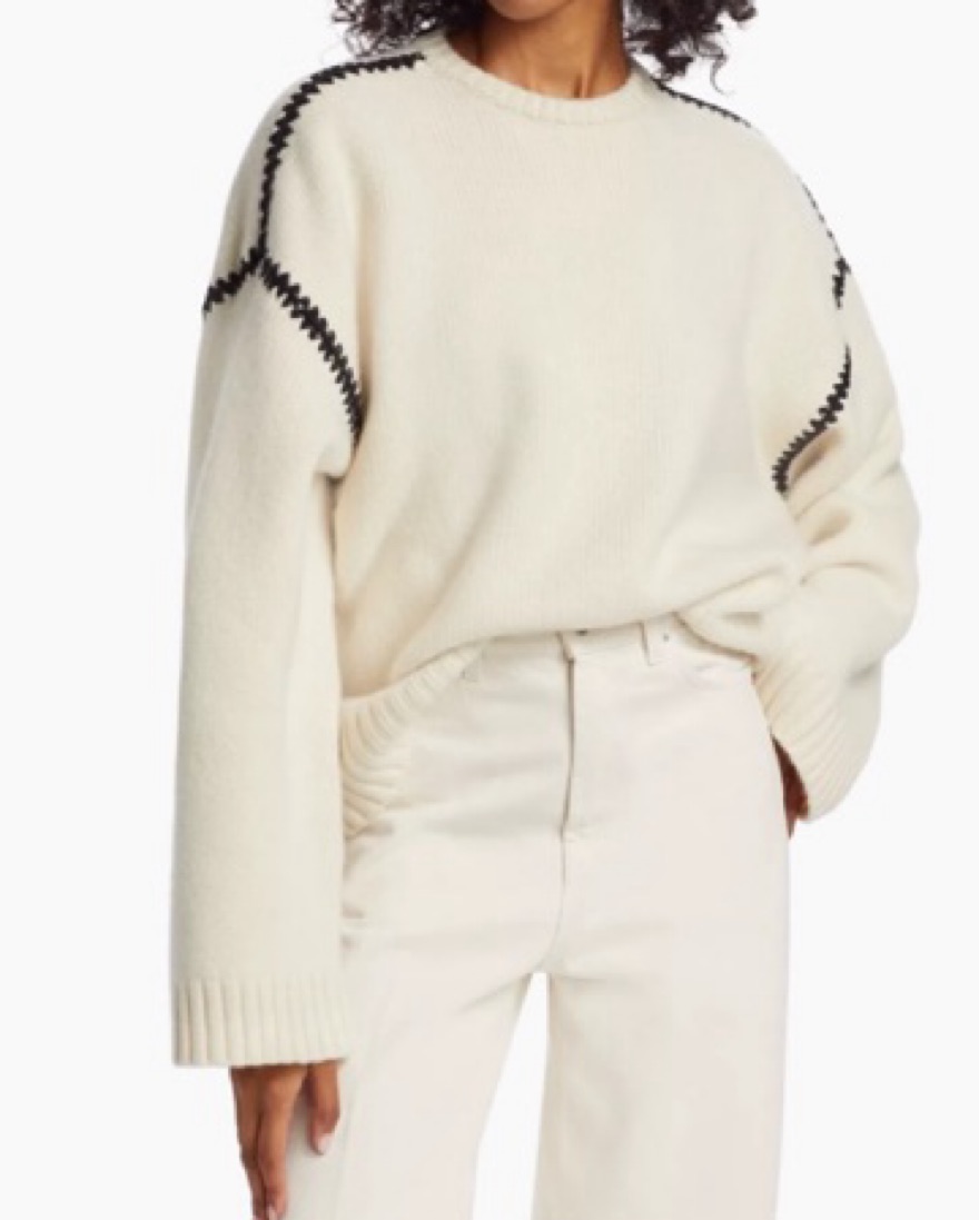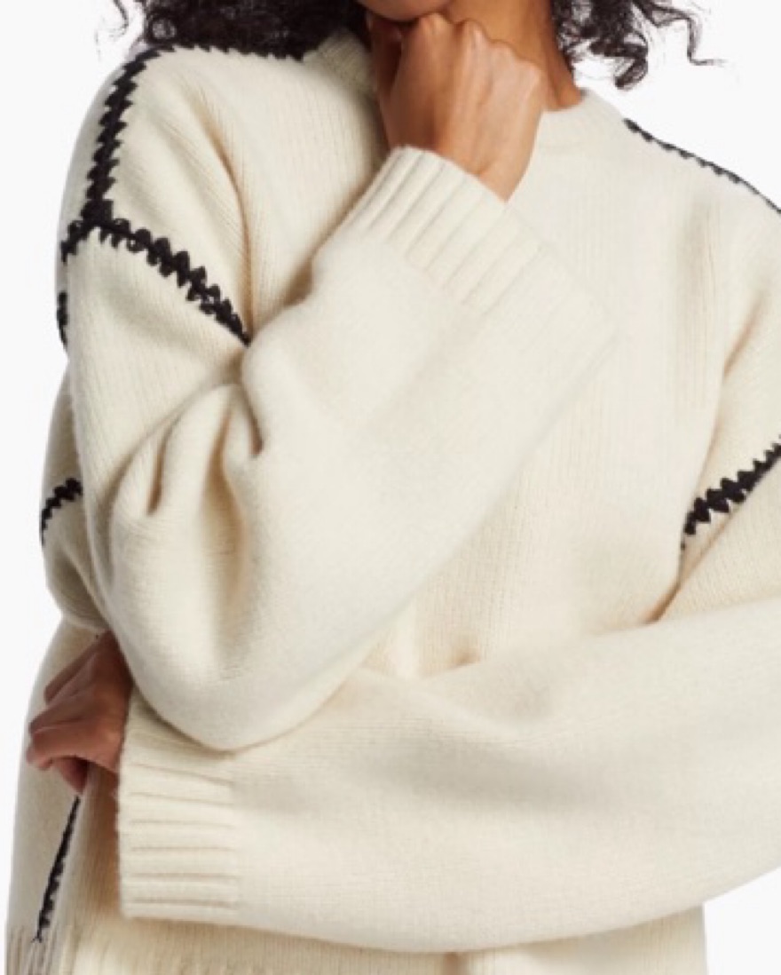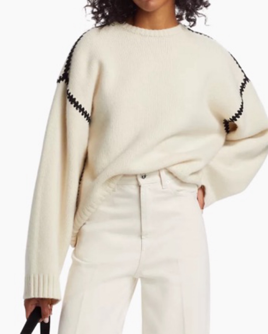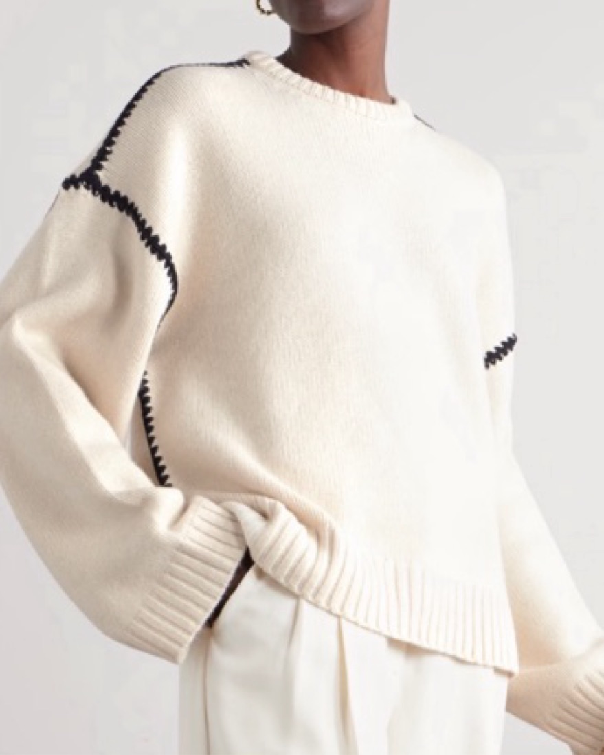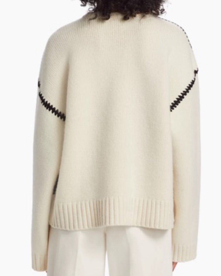 The embroidered wool cashmere knit in snow is a wide sweater inspired by TOTEME's Embroidered scarf jacket. It's knitted from mid-weight wool with a touch of cashmere for warmth and softness. It features an embroidered pattern along the shoulders and armholes with contrasting thread.