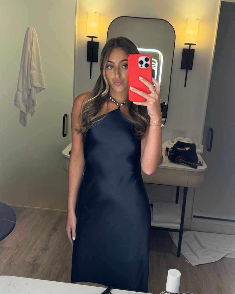Pearl neckline silk navy dress