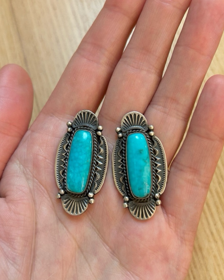I see so many requests for cowboy outfits, I have all you need! Accessories are what bring together the western look. Genuine Diné turquoise and sterling silver earrings, signed. So pretty! 🏜️