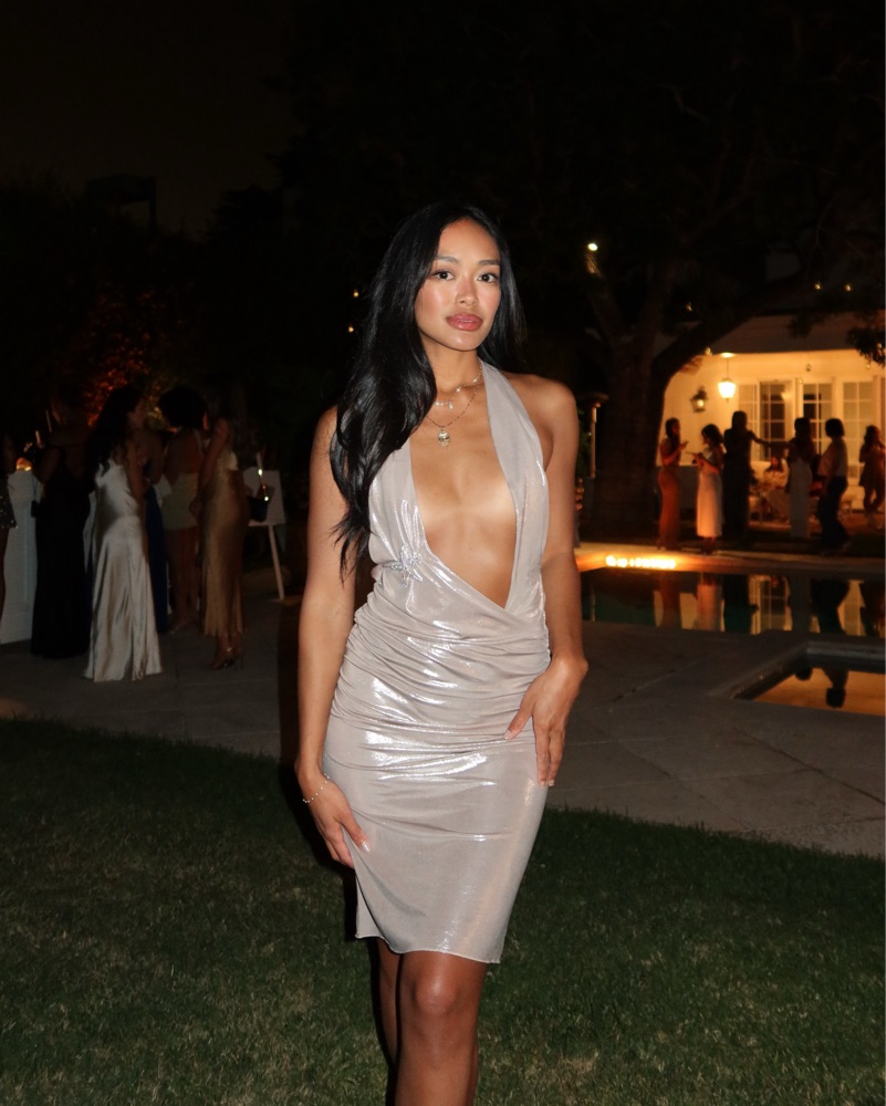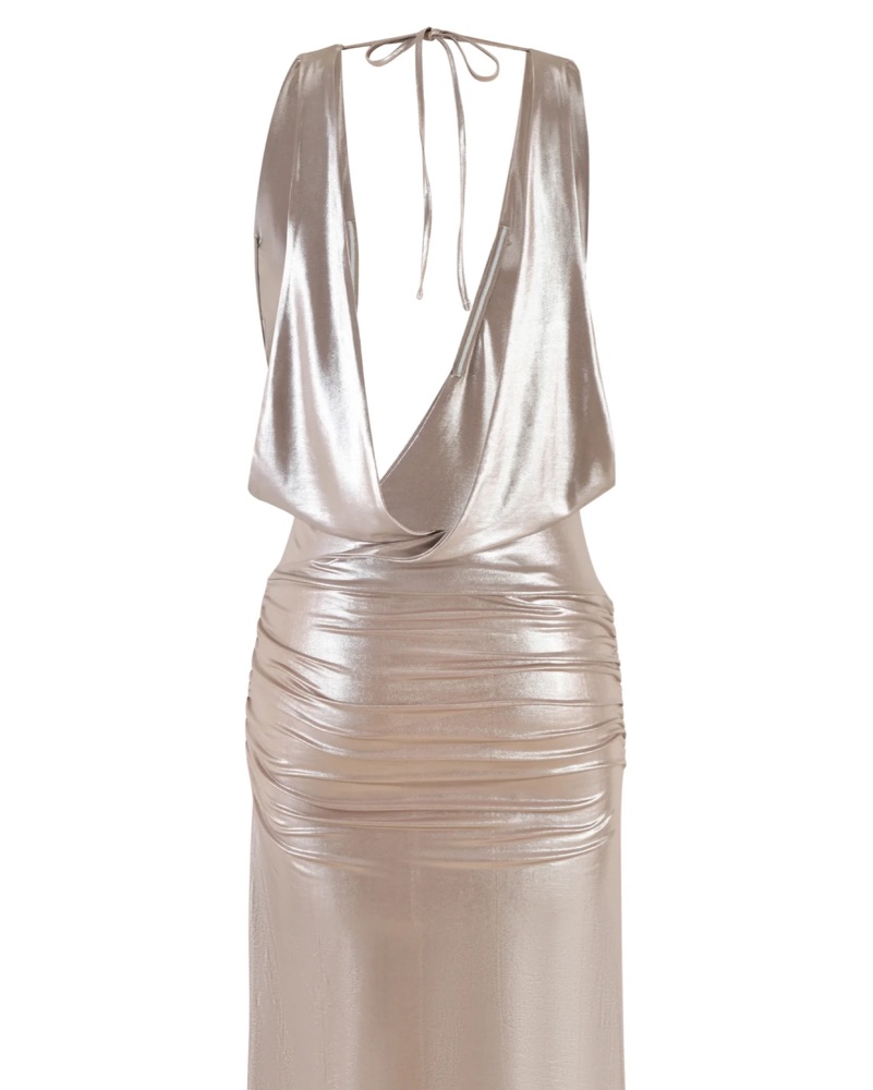Shiny shimmer metallic dress can be styled different ways. Color is closer to a silver but with subtle pinkish hues very sexy