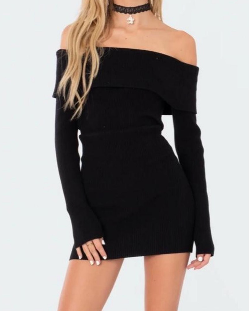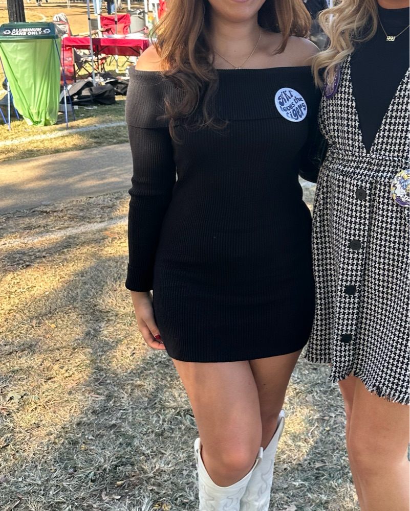 The perfect dress for fall or gamedays! Not too thick of a sweater material. Cute off the shoulder!