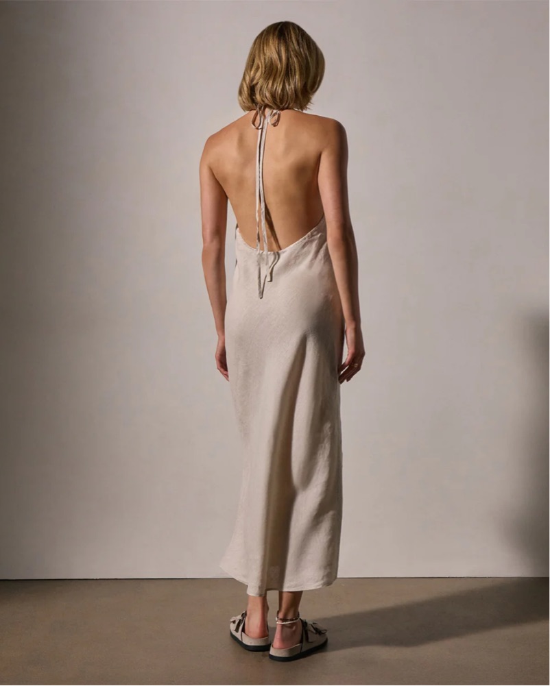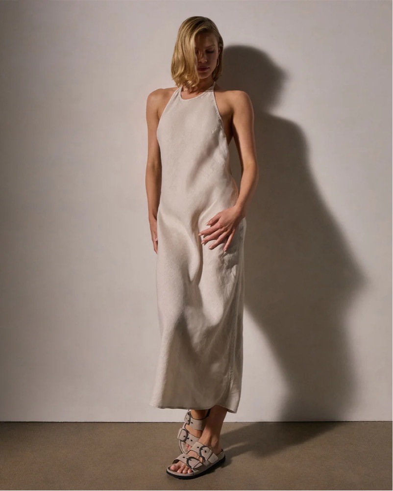 Color: salt pigment. Made in our classic lightweight linen that is breathable and soft. Halter tie at back, clean finish hem, bias cut. Perfect for summertime. Vince, dissh, James perse, theory, sir the label.