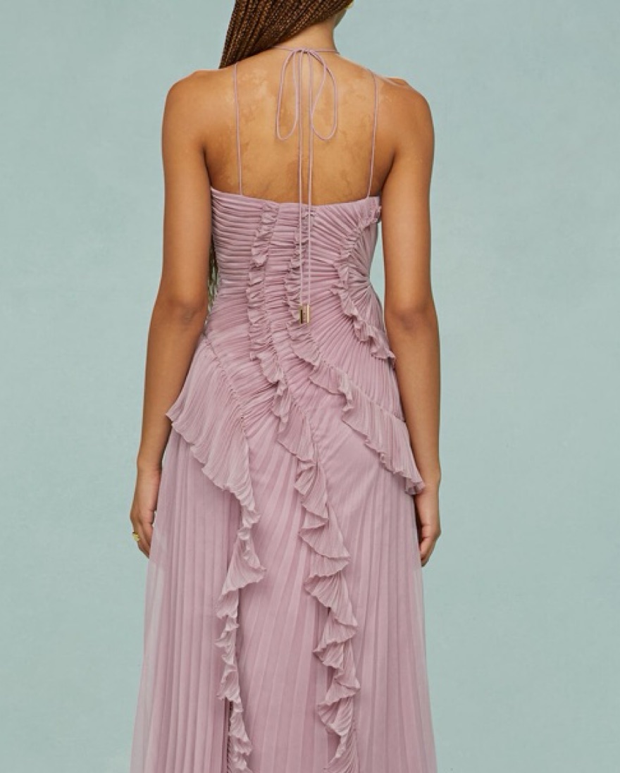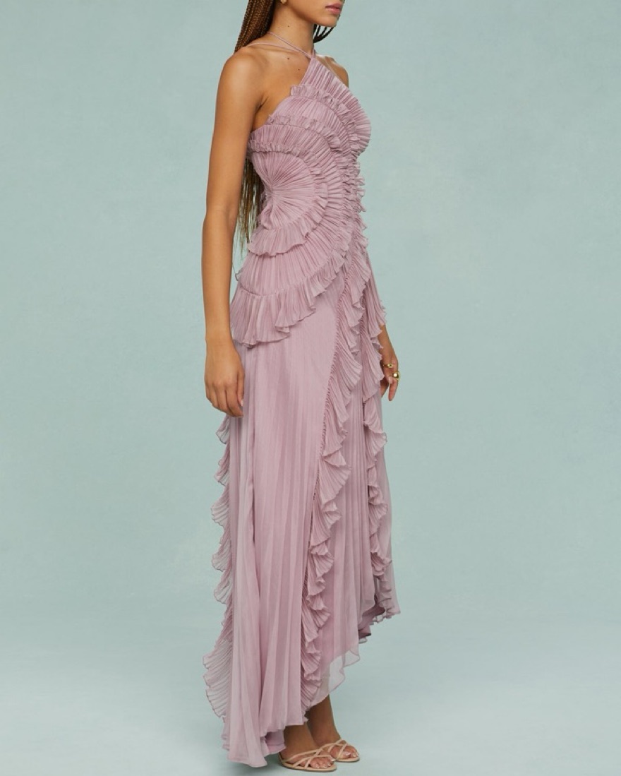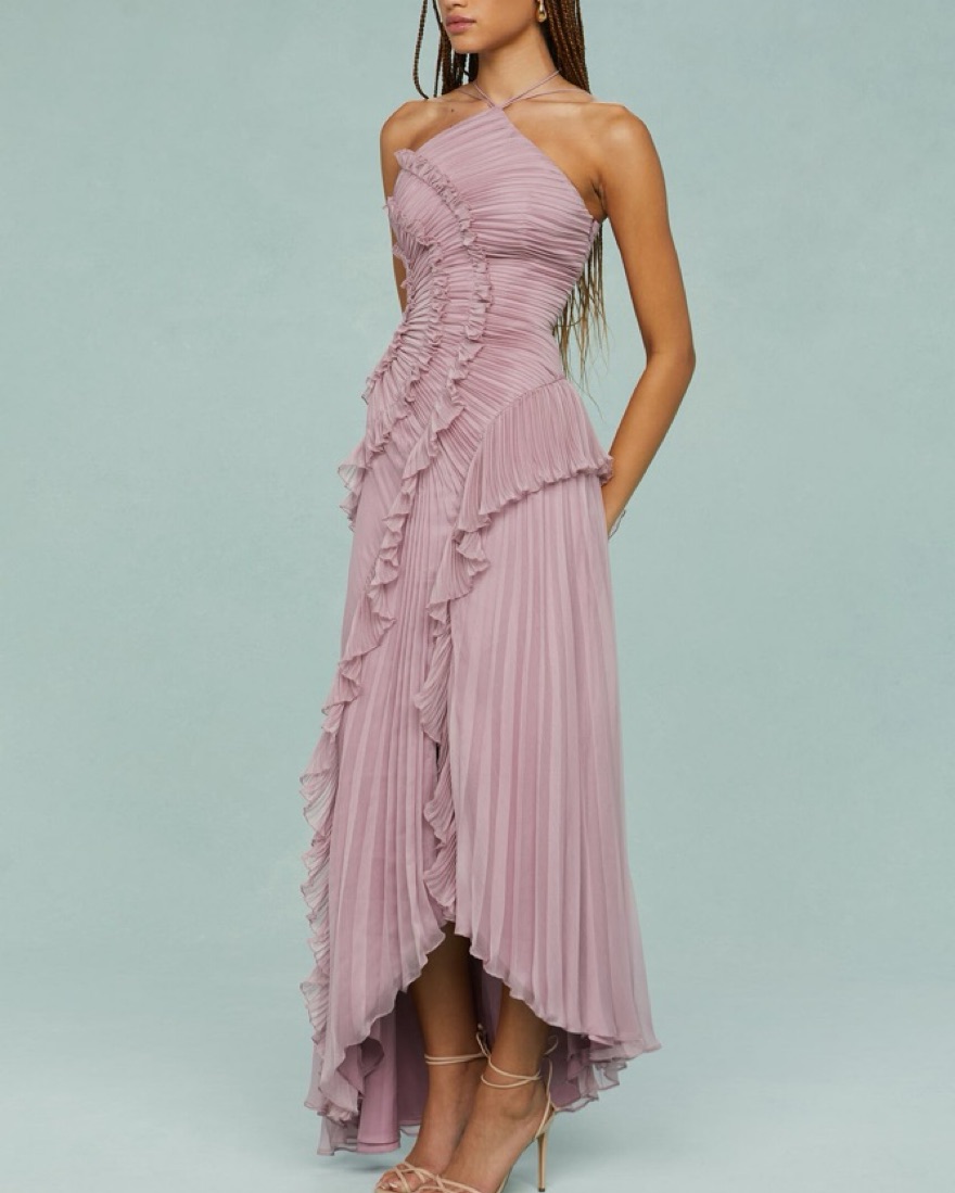 The most flattering dress! Dramatic ruffles, pleated swirl details, semi high-low. Midweight chiffon hugs waist! Subtle leg slit. So precious and feminine — be ready for lots of compliments 💗