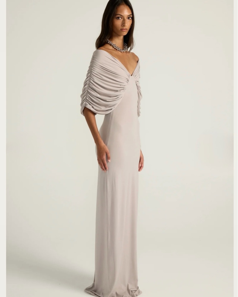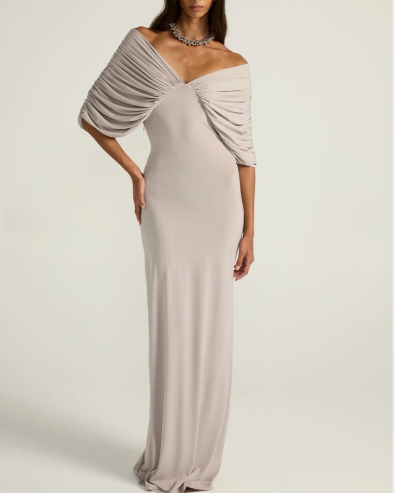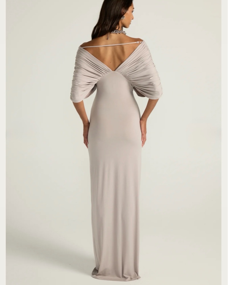 BRAND NEW DESIGN by Ance Gria 💓 sold out everywhere. This captivating off-the-shoulder gown is perfect for a formal event or gala. The ruched details and shimmering necklace create a stunning, elegant look. Material is stretchy so can fit a XS-S. Will charge dry cleaning if dirty. Price is firm