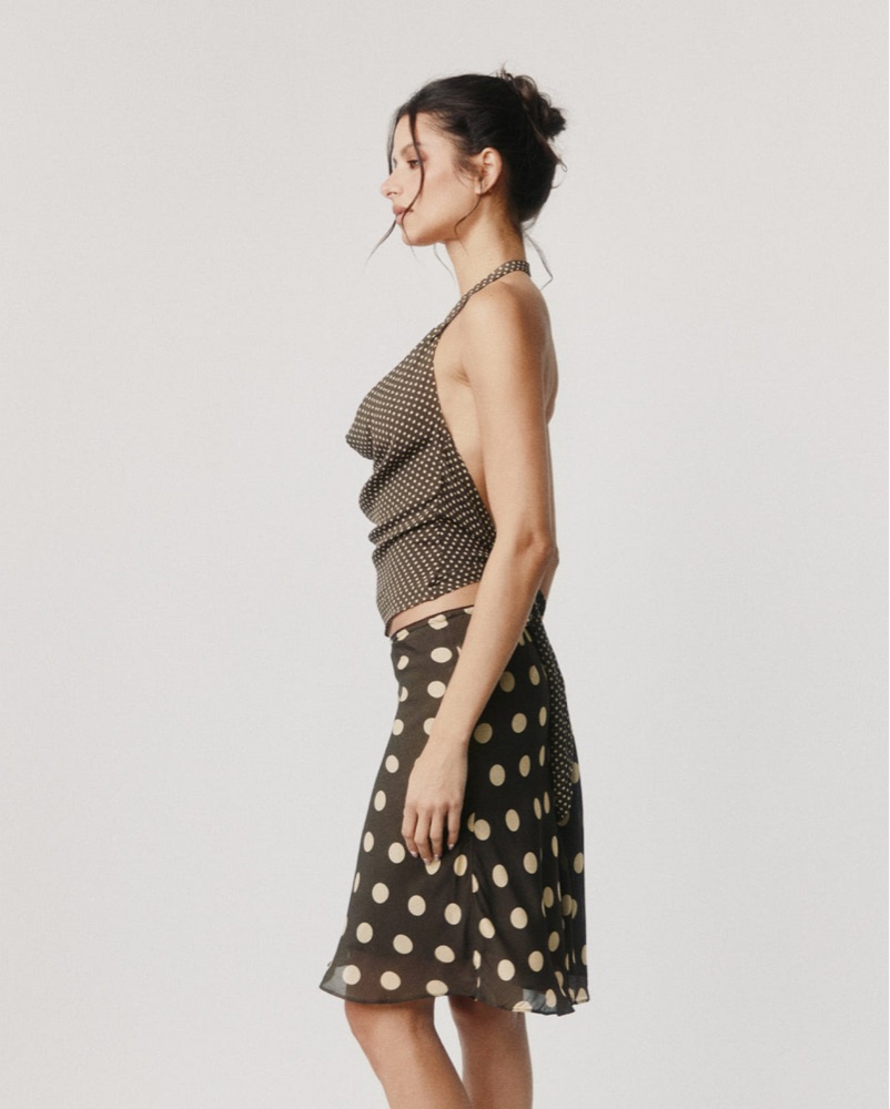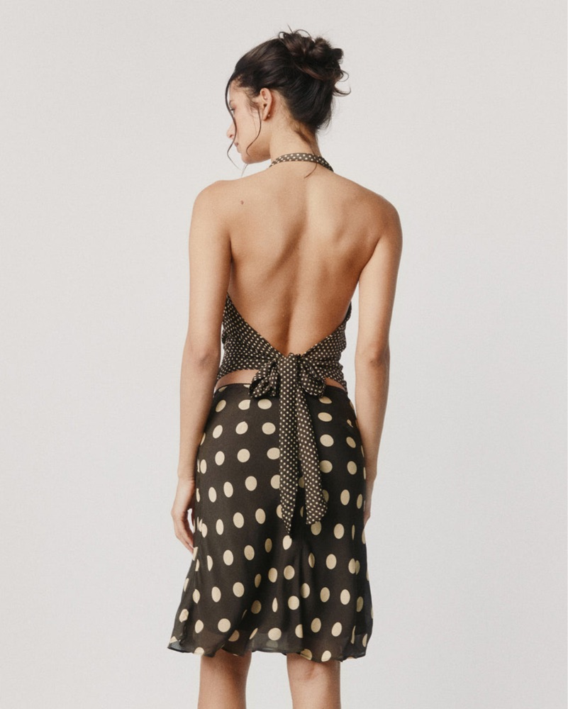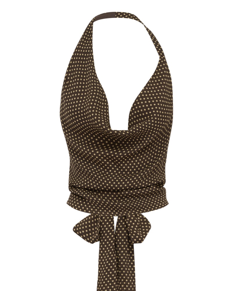 Brown halter top with yellow polka dots. Open back is so cute and flattering! Perfect condition.