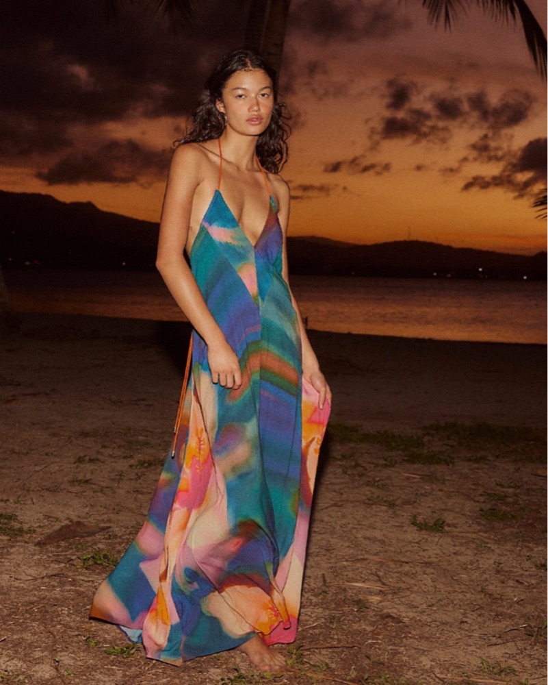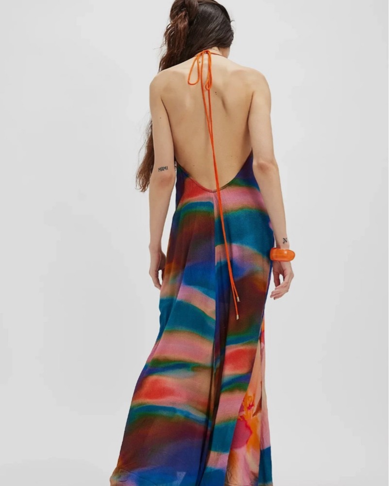 Flattering halter-style V-neckline with an open back and adjustable tie for the perfect fit. Lightweight with a relaxed, breezy silhouette. The perfect dress for vacations, brunch, or summer nights.