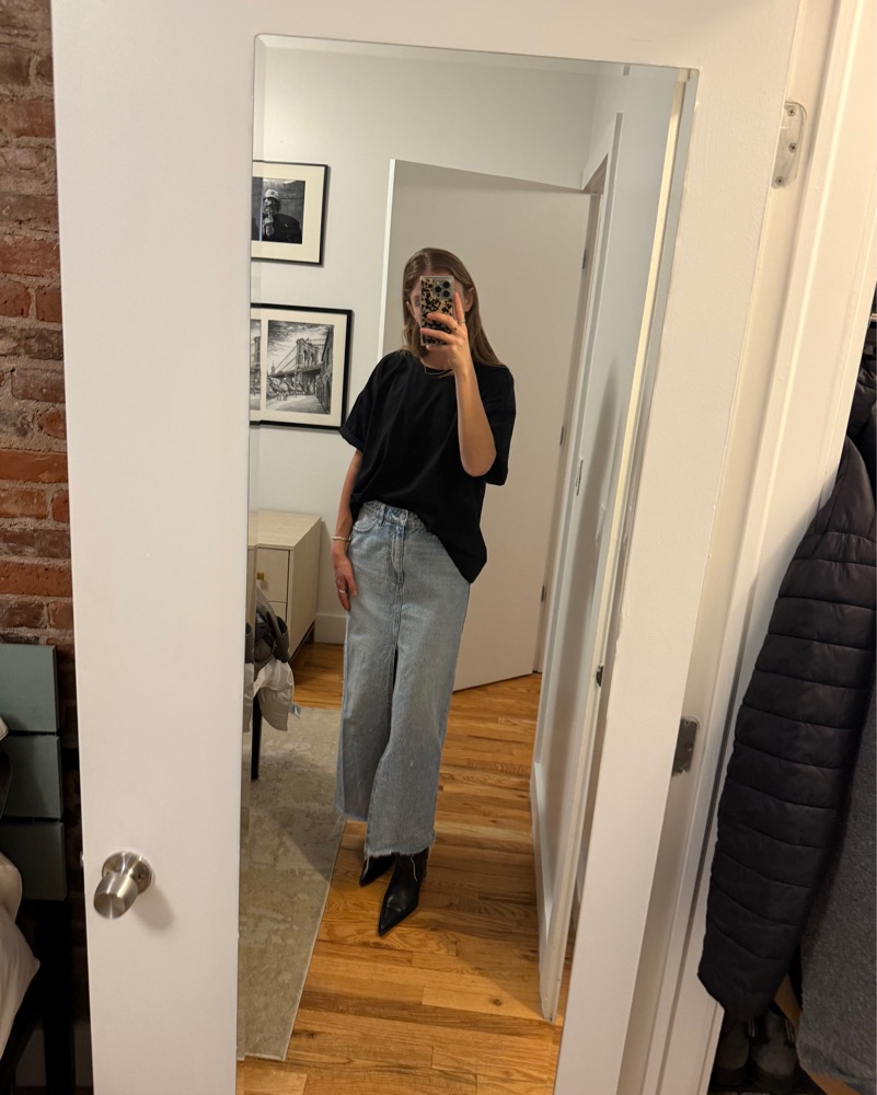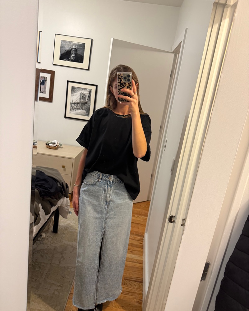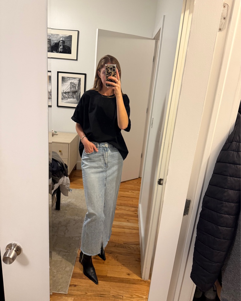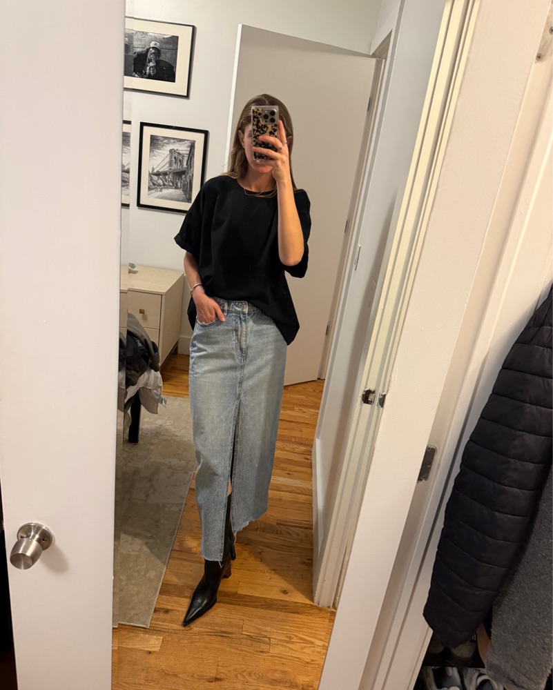 The perfect fit and color for a maxi denim skirt. Easy to dress up or down.