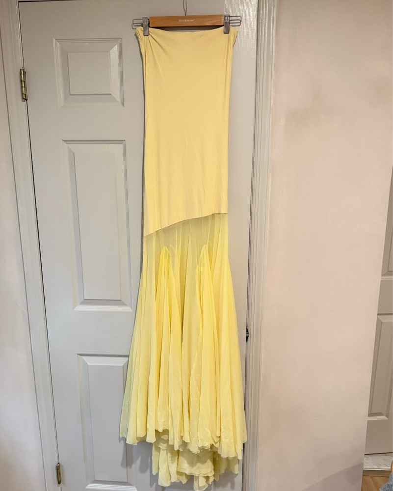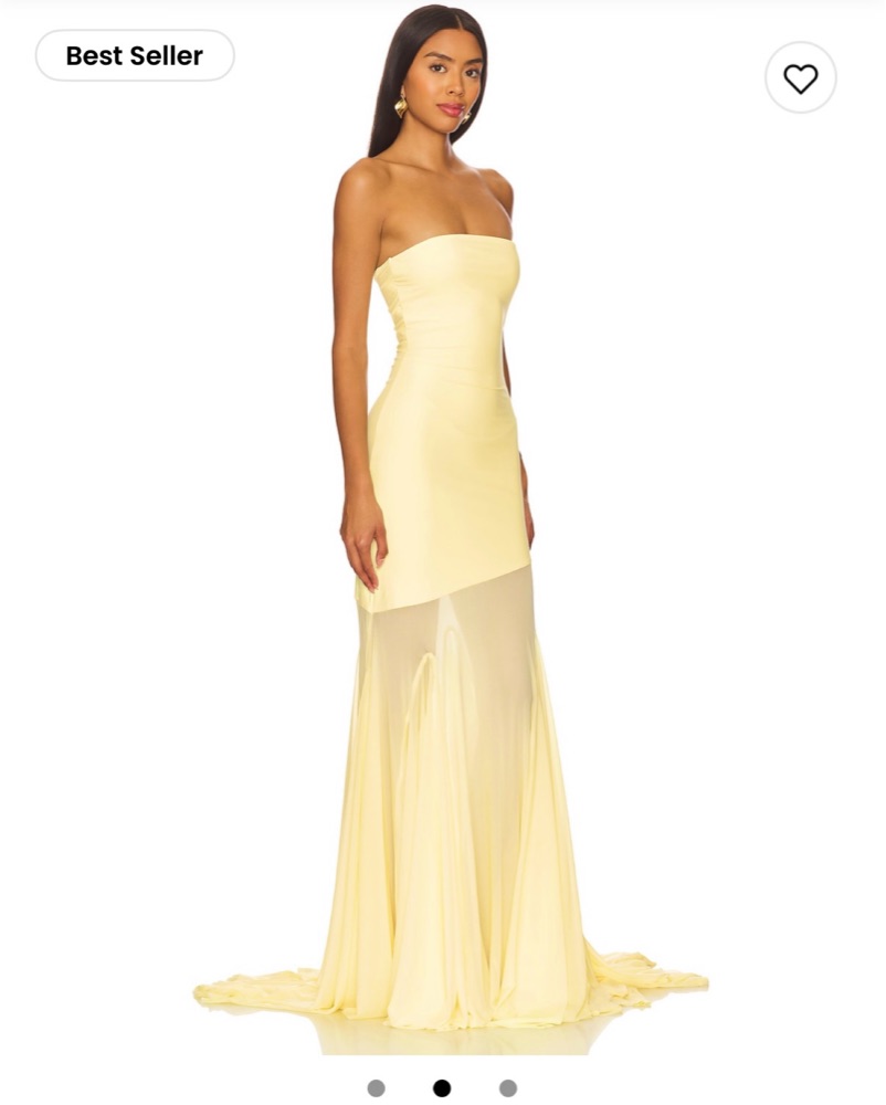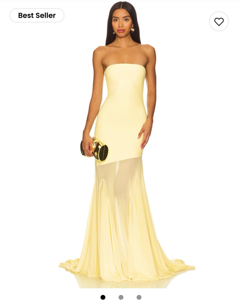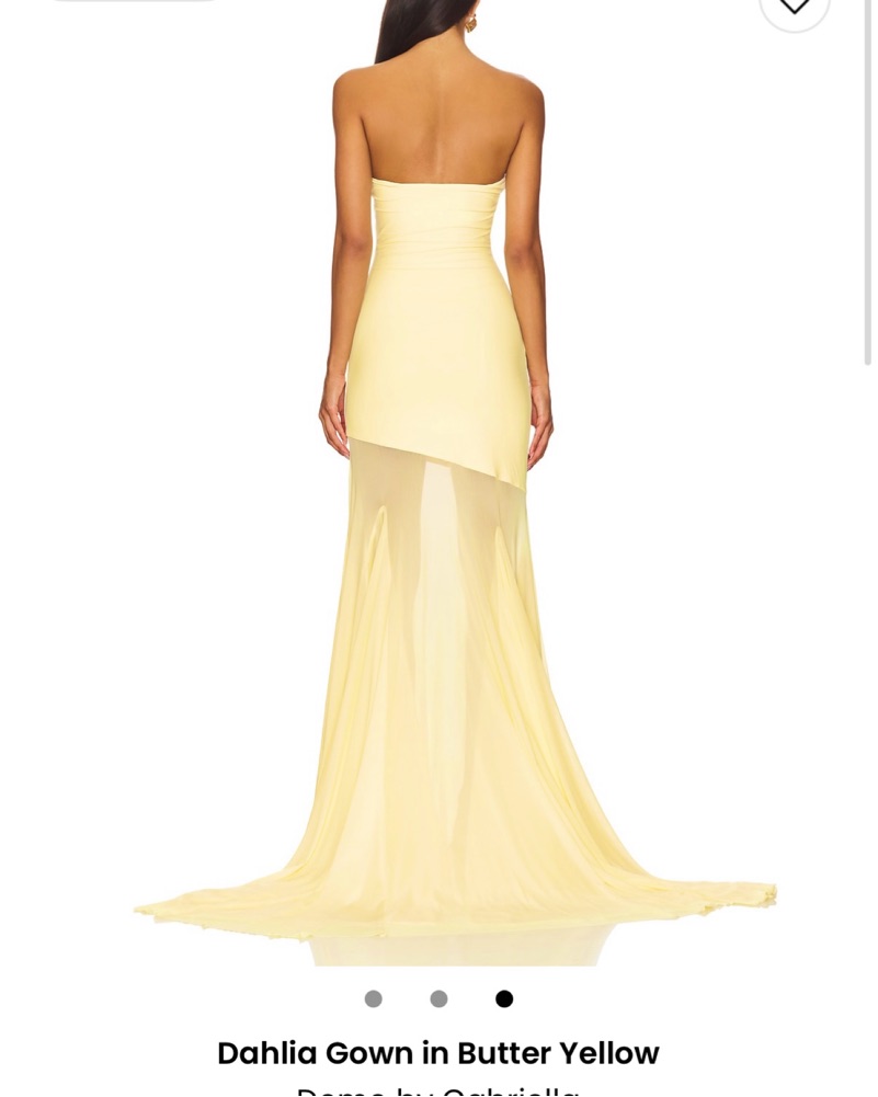 Dahlia Gown in Butter Yellow. brand: Deme by Gabriella This stunning butter yellow gown is perfect for any formal event or special occasion. The flowing, figure-flattering silhouette creates an elegant, sophisticated look.