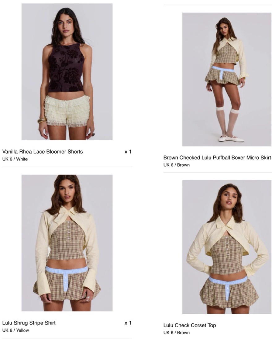 Full oufit included as shown in last photo: Lulu Check Corset Top, Brown Checked Lulu Puffball Boxer Micro Skirt, Lulu Shrug Stripe Shirt, and Vanilla Rhea Lace Bloomer Shorts