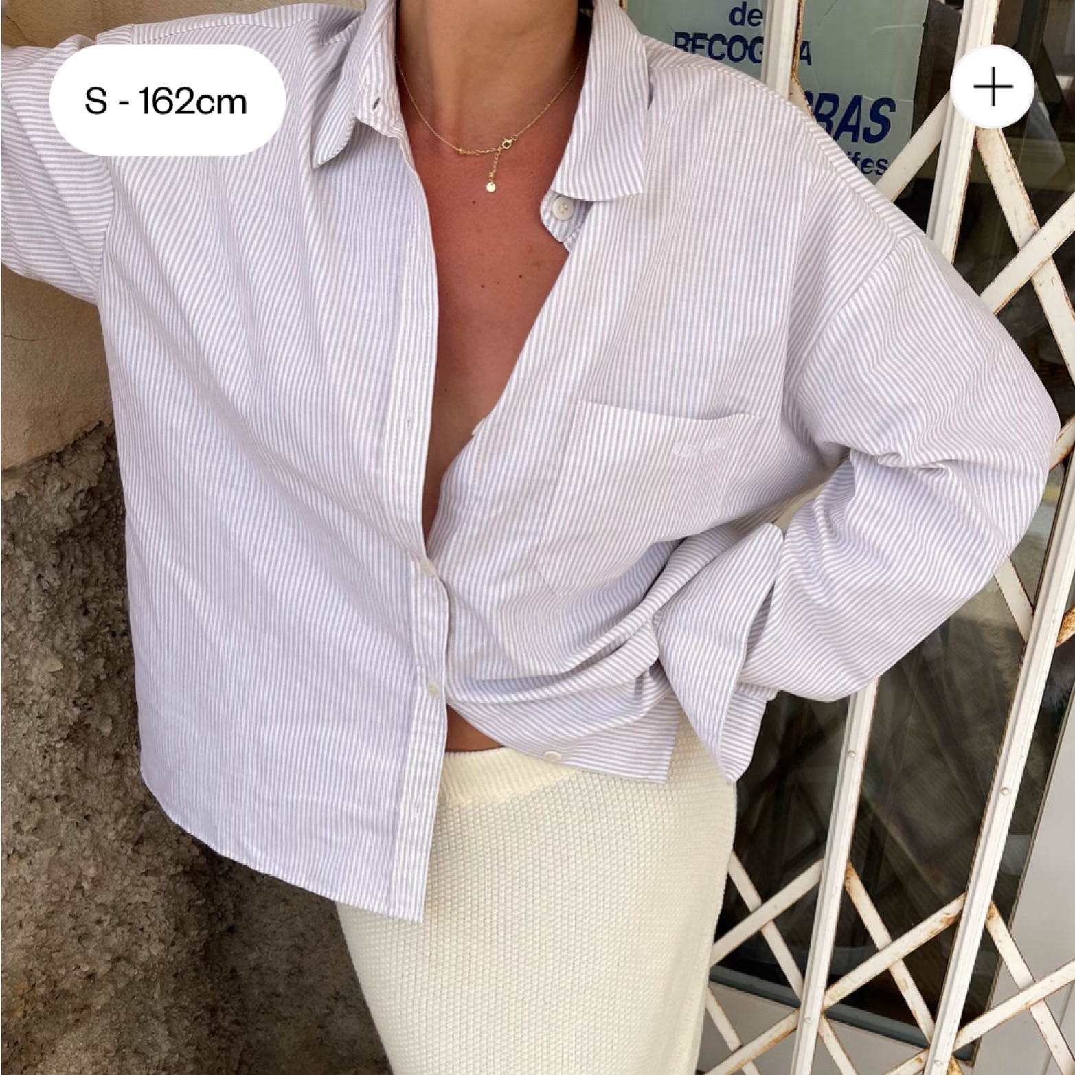 Djerf Avenue Breezy Shirt Beige Stripe. Is an oversized fit with a slit in the back. Great for the office/work or vacation depending on how it’s styled.