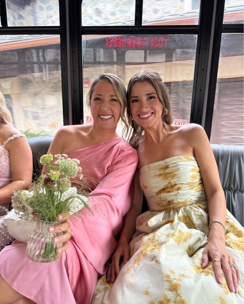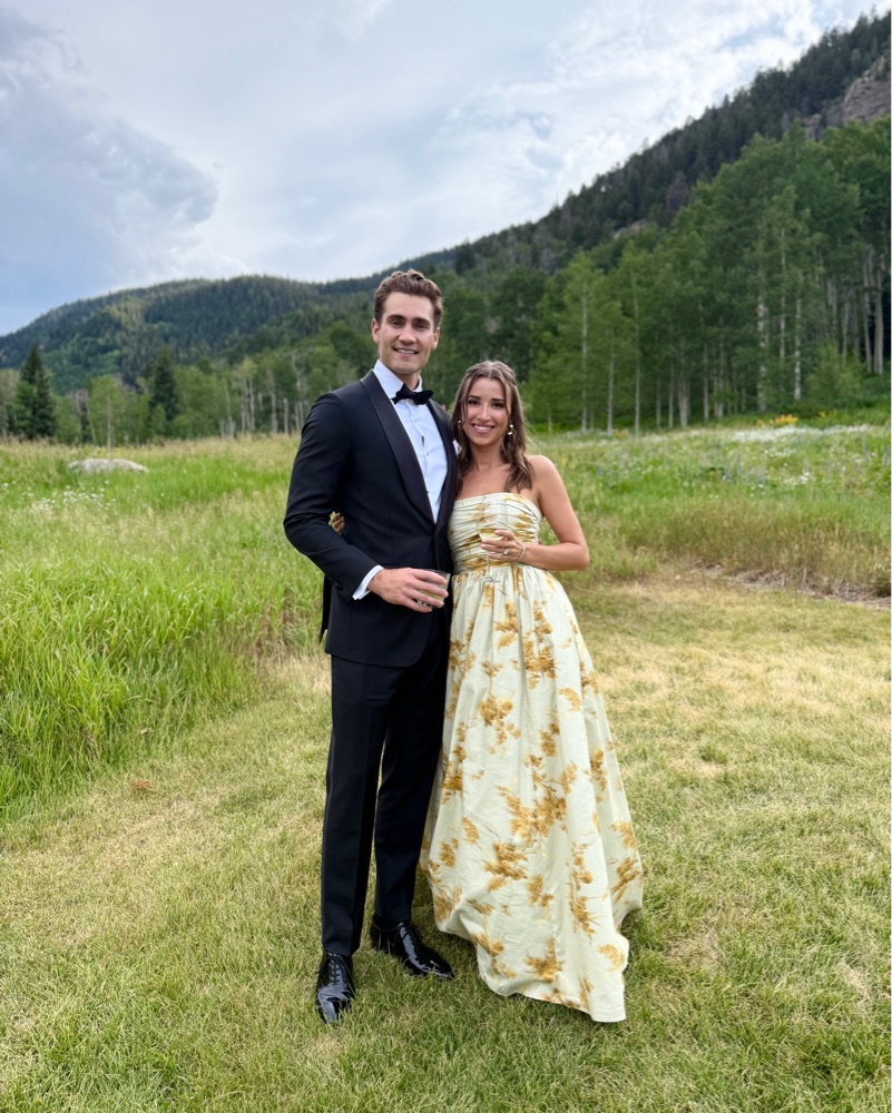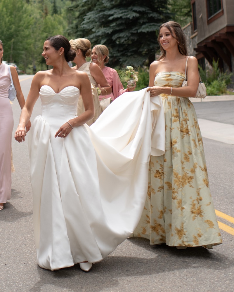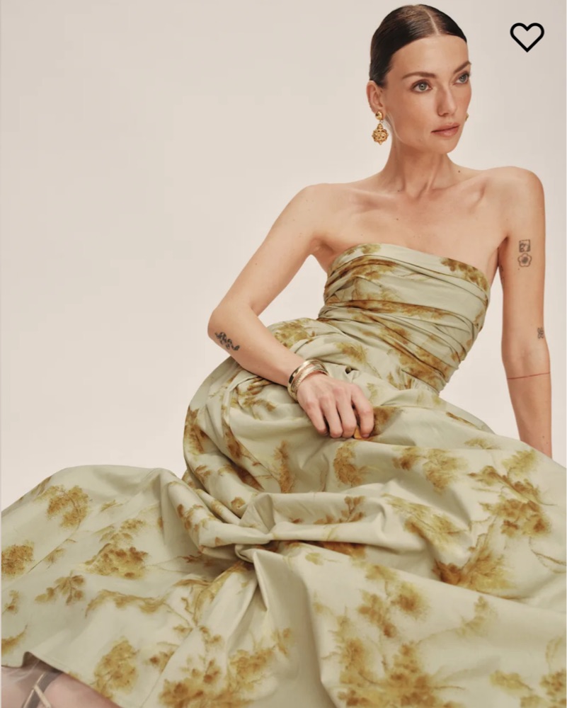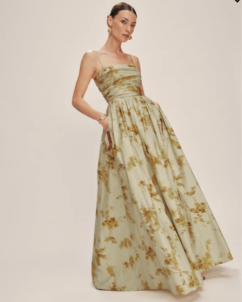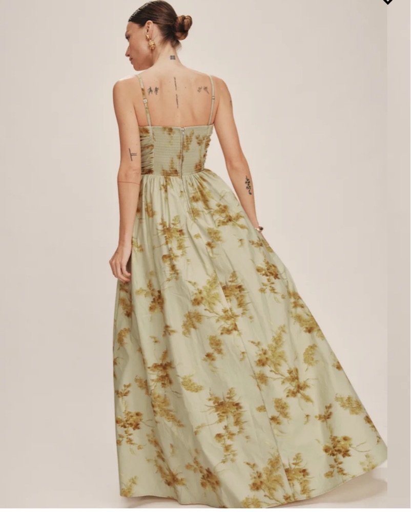 Maxi floral dress from reformation. Has tulle lining so sort of puffier look if that makes sense (think sort of bridal gown feel) so more formal. Sooo comfortable. Straps are removable so you can wear with or without. I’m 5’6” and wore 3 inch heels with it so this one’s for my taller girlies!