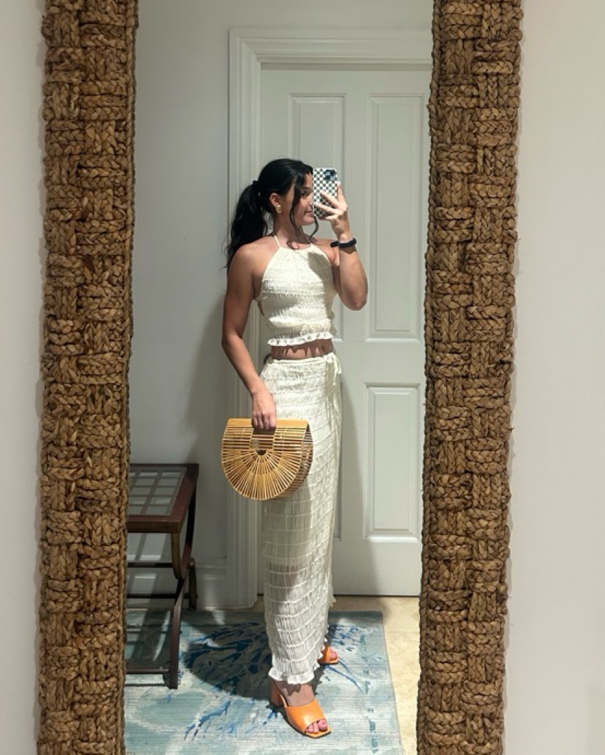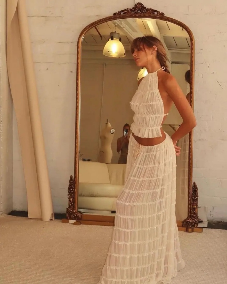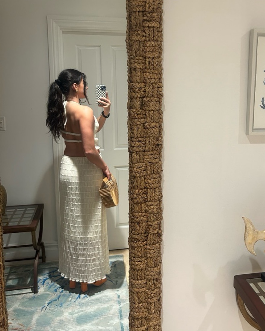 Very similar dupe!!! Halter top with tie behind neck, straps across back are also adjustable. Skirt is half lined and has drawstring so can be adjusted. Can rent separately if you want, just message me