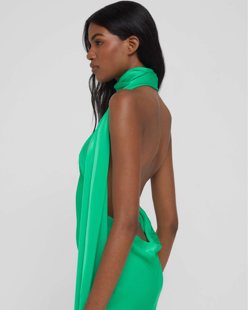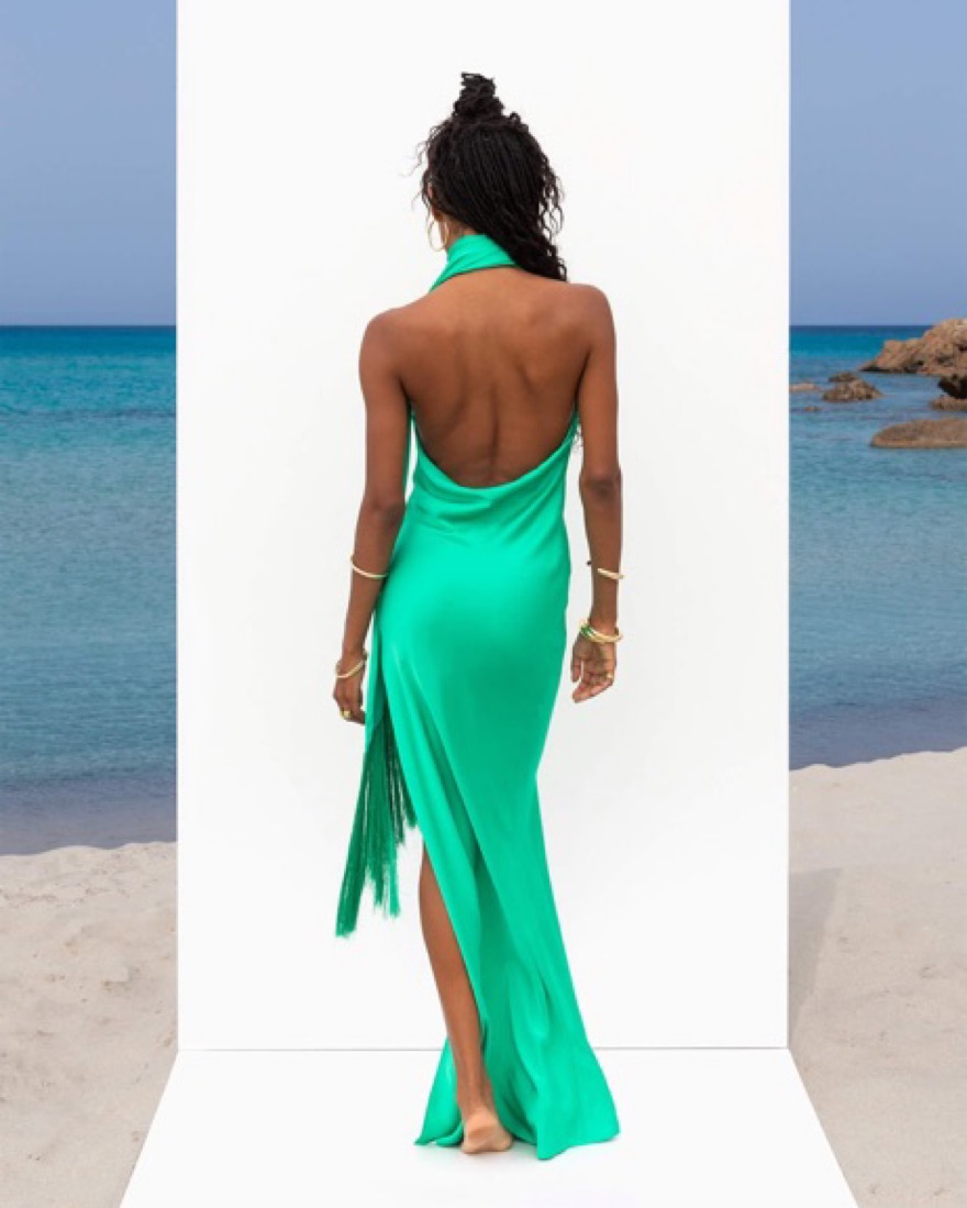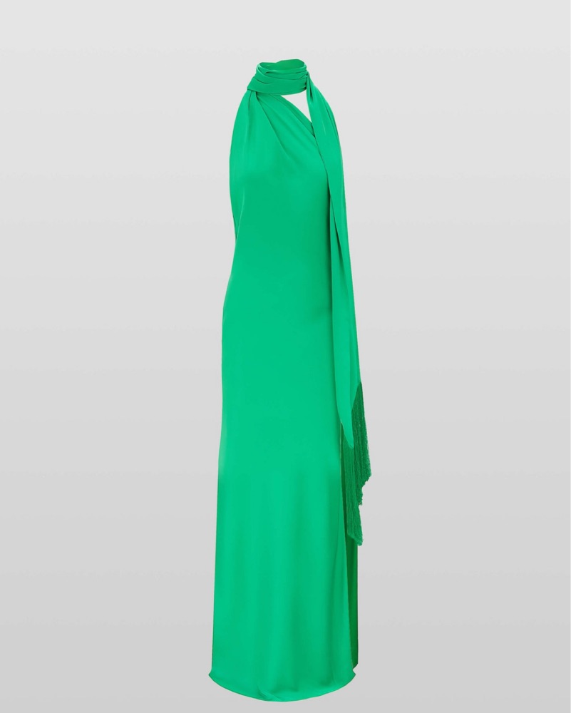 The ultimate occasion dress, Azzara is a fresh and flawless one-shouldered maxi with an elegantly tasselled scarf ready Green brand new open back, very