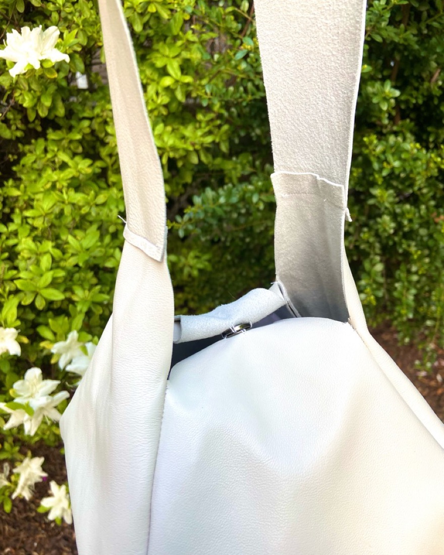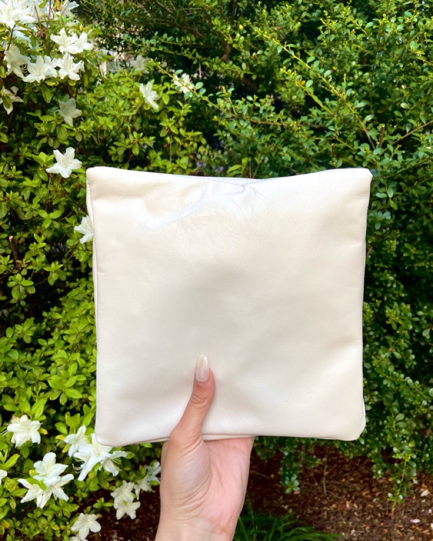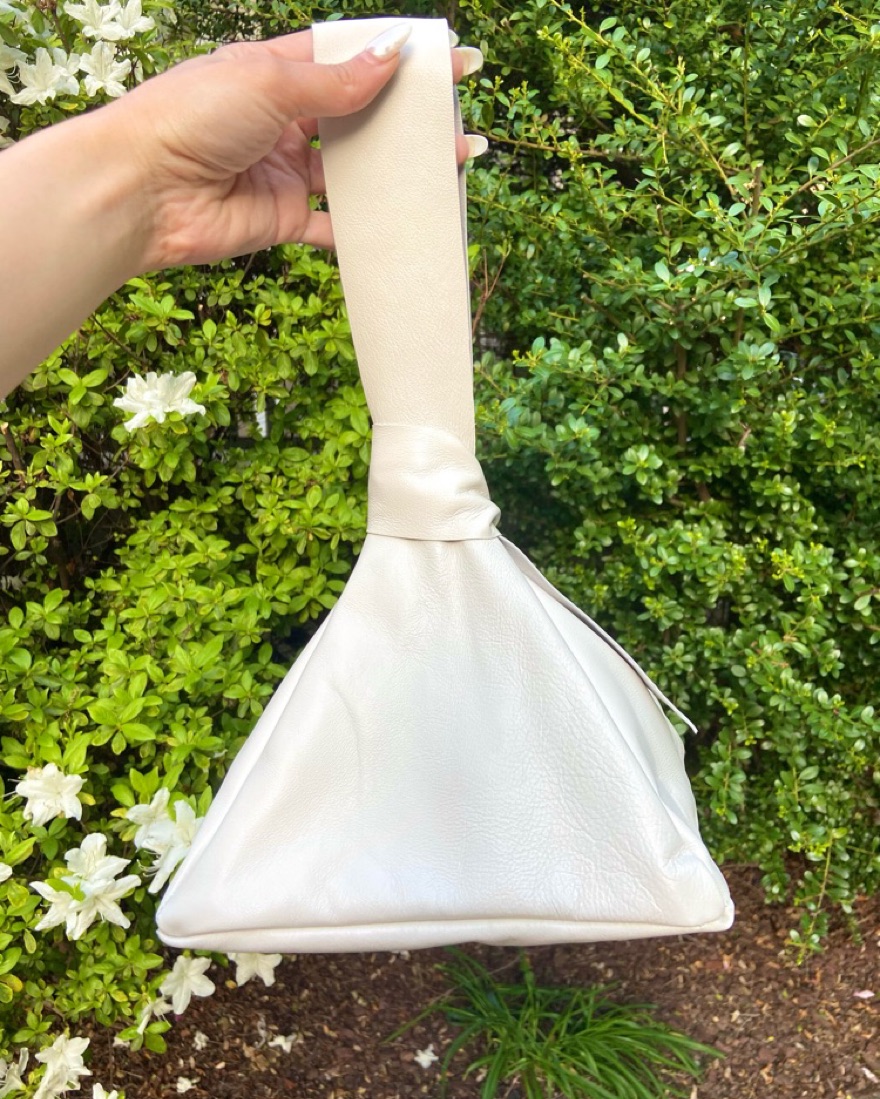 A pyramid shaped purse designed and handmade by me! It’s made of real leather that’s super soft and really good quality. This colorway is a white (more like off-white). There’s more colors available and really cute for going out!
