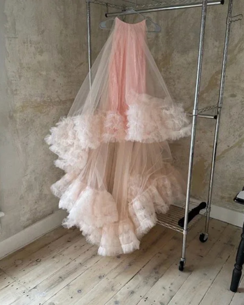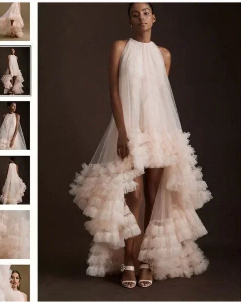 Dramatic fun dress with lots of tulle volume. Sleek high neck. Fun for wedding guest outfit