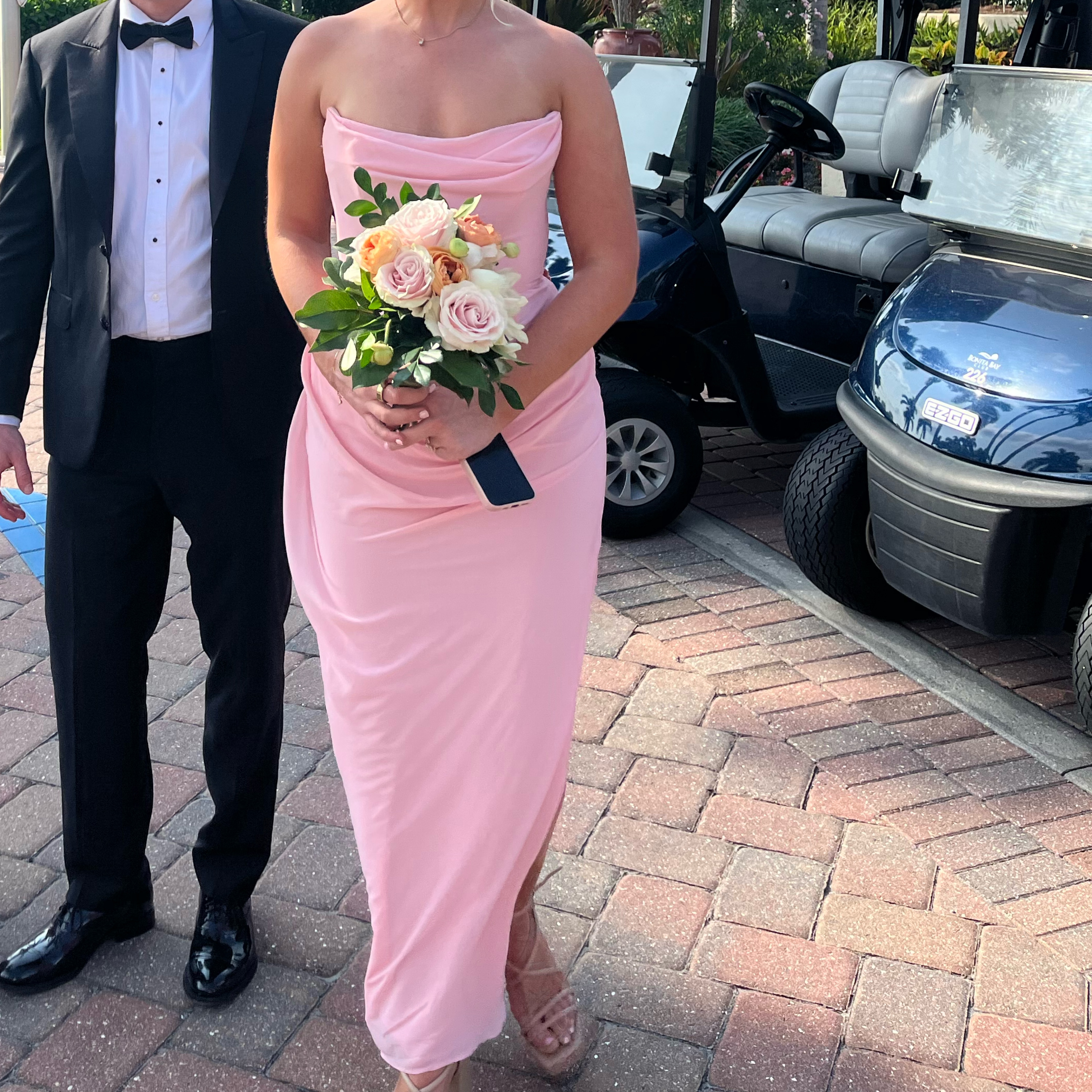 So flattering and beautiful! Perfect for weddings or other formal events. I got compliments all night. Im also selling the same dress in a medium (NWT)