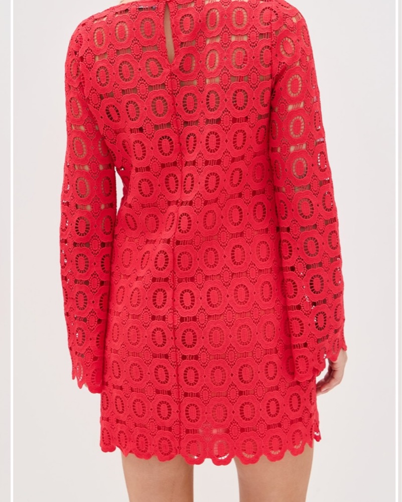 This vibrant crochet lace dress is perfect for a night out or special occasion. The intricate pattern and bold red color make it a statement piece that is sure to turn heads.
