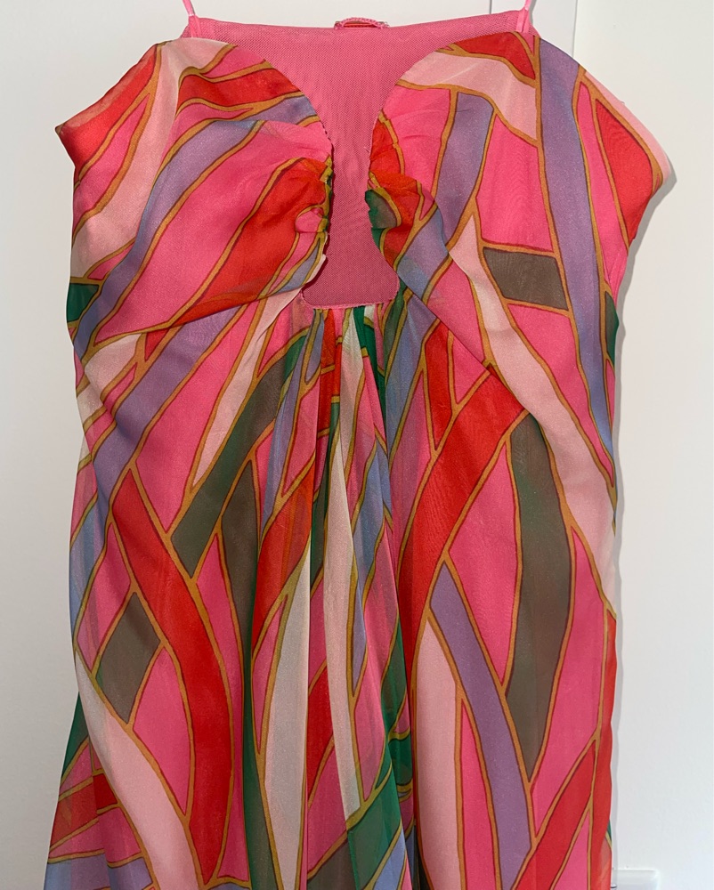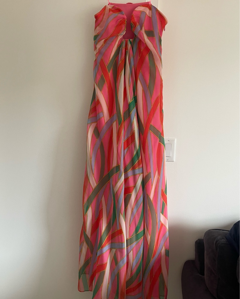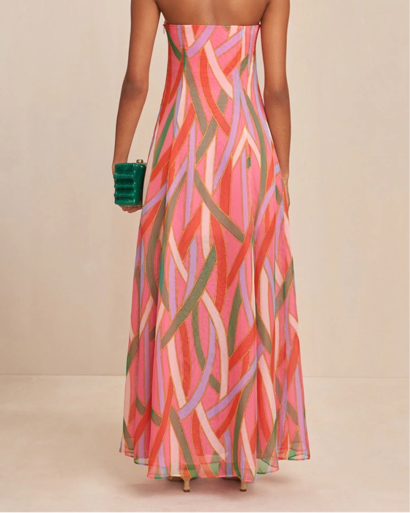 This vibrant printed maxi dress is perfect for a summer party or vacation. The bold color palette and flowing silhouette create a stylish and eye-catching look.