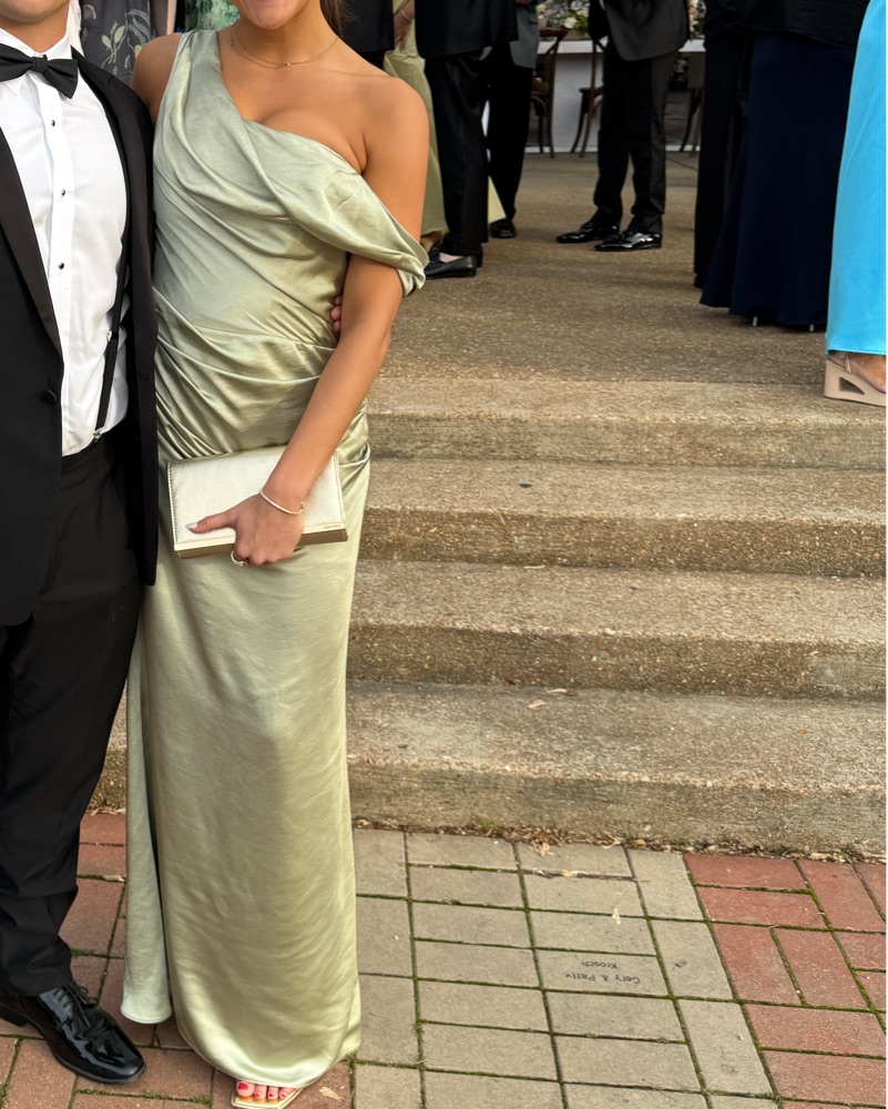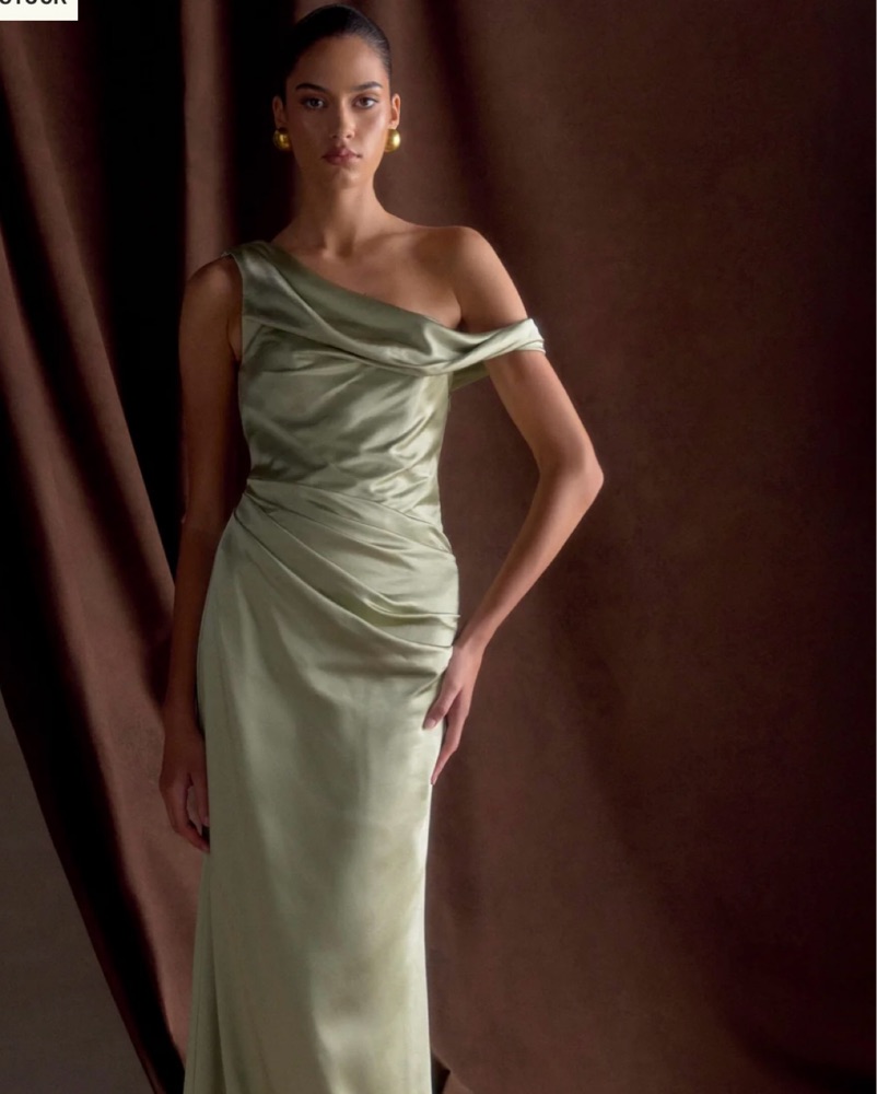 This stunning one-shoulder gown in a lovely sage green hue is perfect for a formal occasion like a black-tie event or wedding. The draped silhouette creates a sophisticated and eye-catching look.