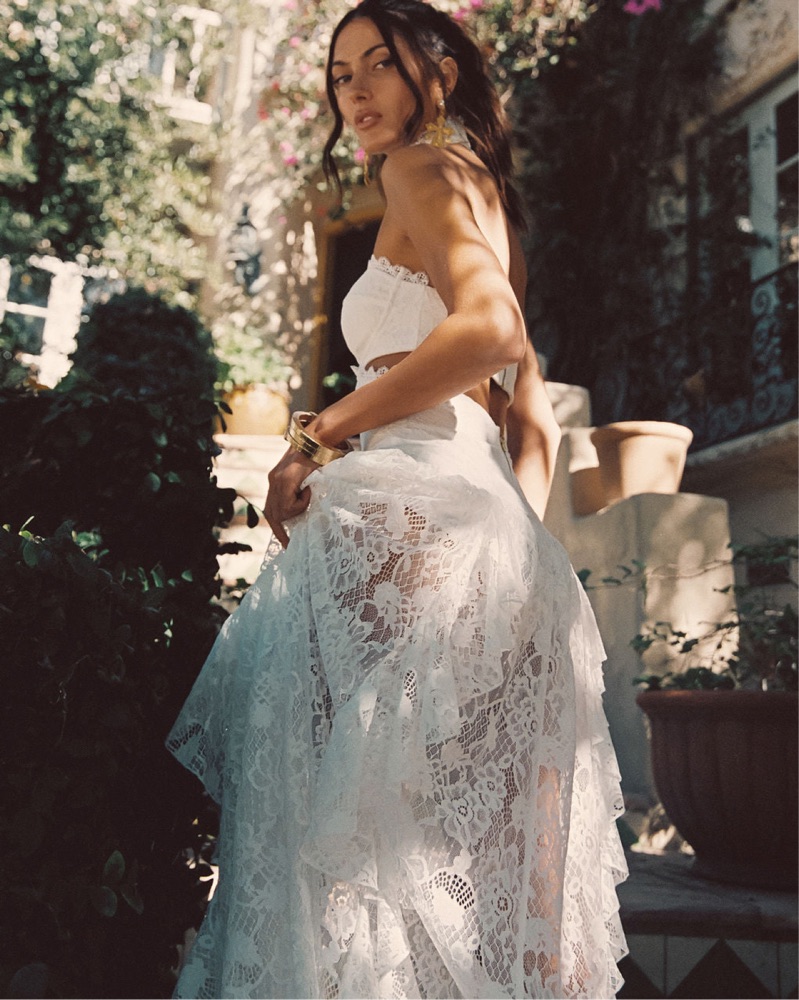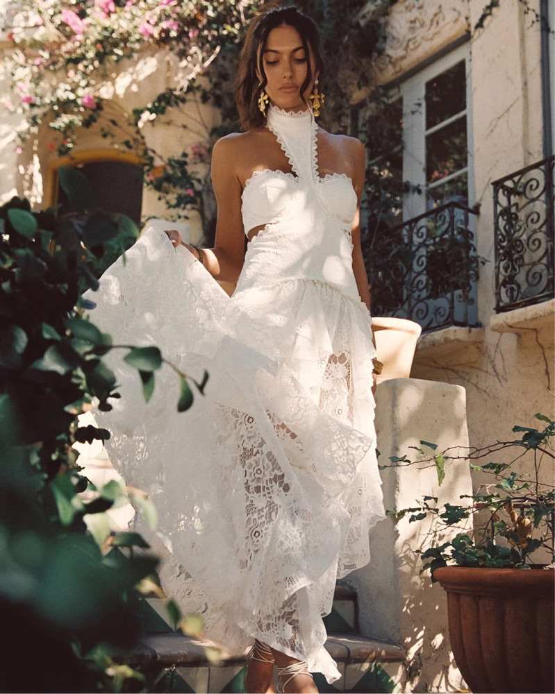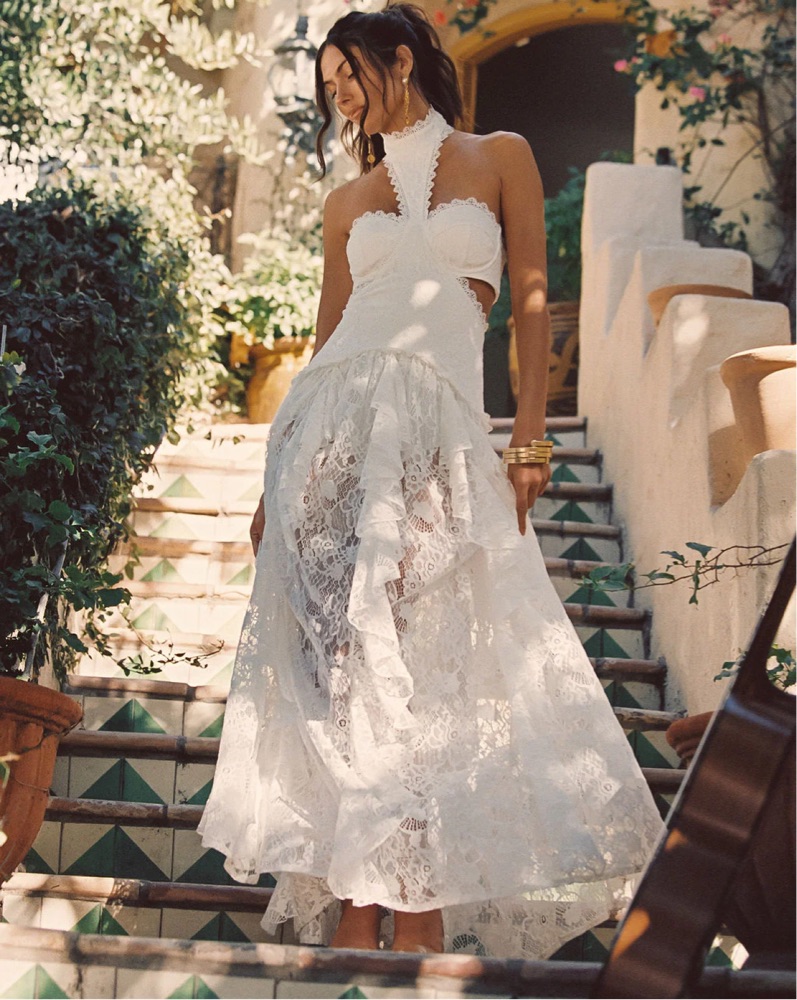 With the same high neck, drop waist and sheer lace skirt, now a romantic white on white the Princesa is a must during your bridal era. Pop the champagne and feel glamorous in the Princesa and cheers to an unforgettable night ahead.