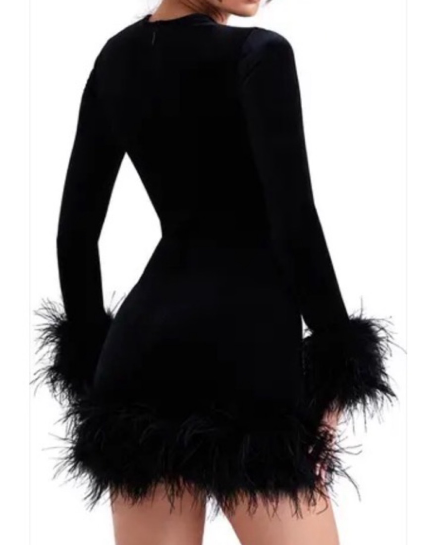 New condition! Black long sleeve feather trim dress. Super flattering and soft material.