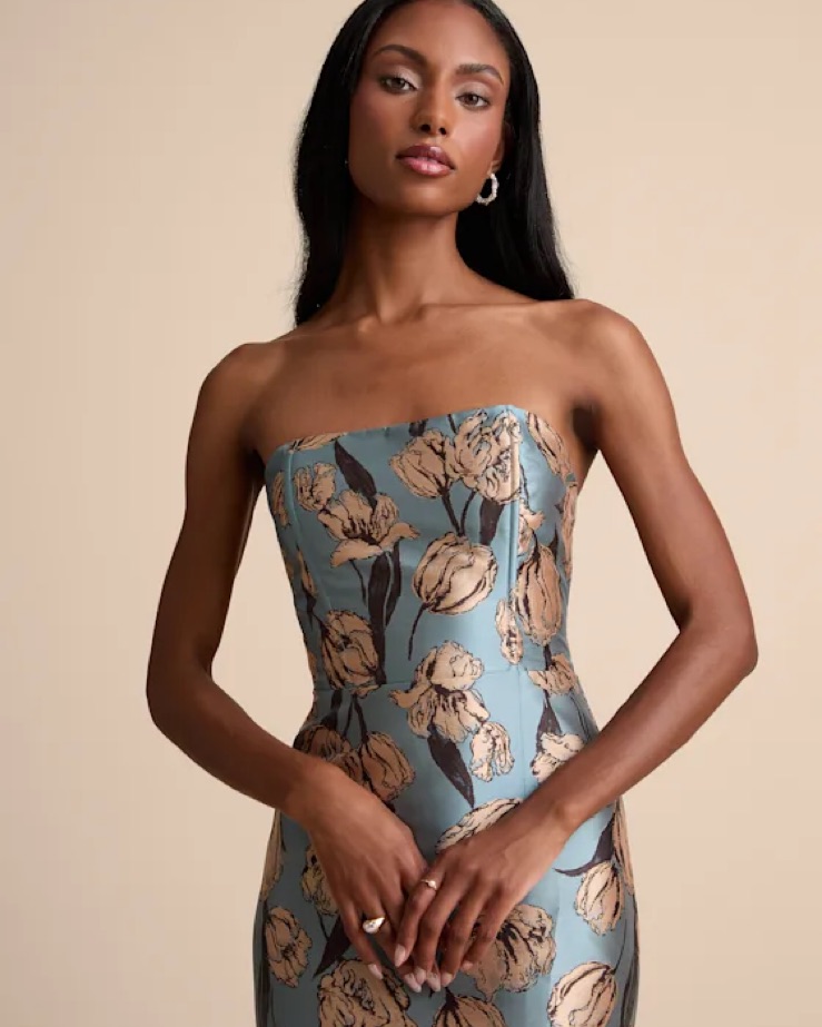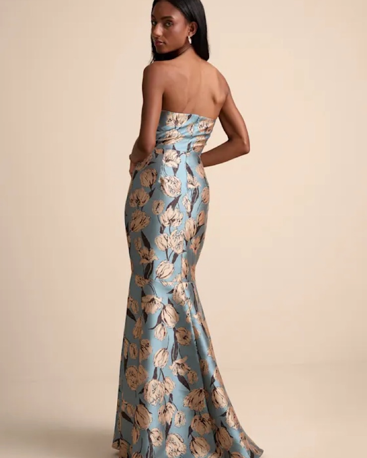 Gowning Around Slate Blue Floral Jacquard Strapless Maxi Dress. Fits a 4-8