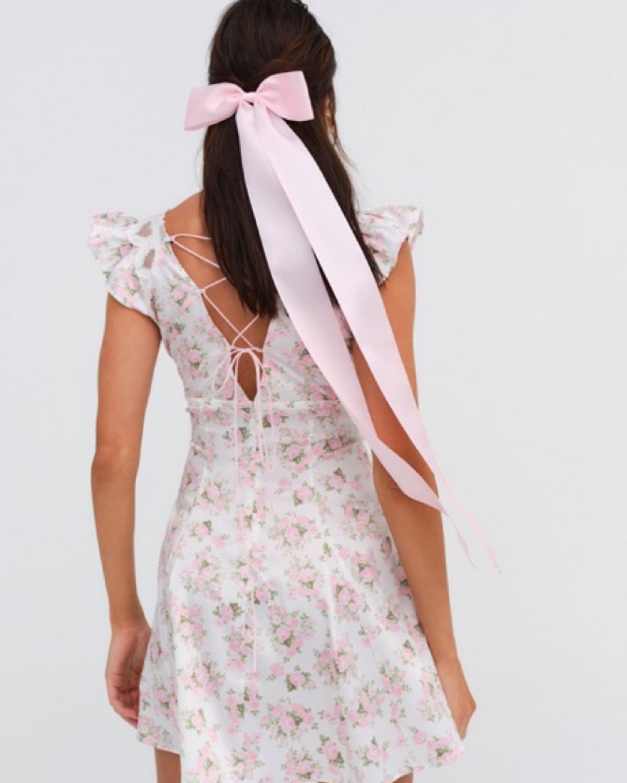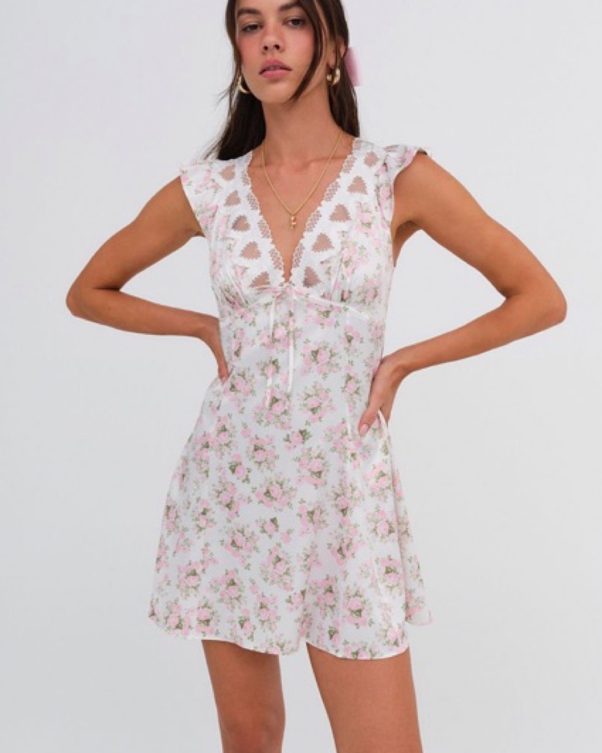 This sweet, vintage-inspired style features feminine ruffles offset by an all-over rose print. Flutter sleeves and embroidered heart details at the neckline complete the look